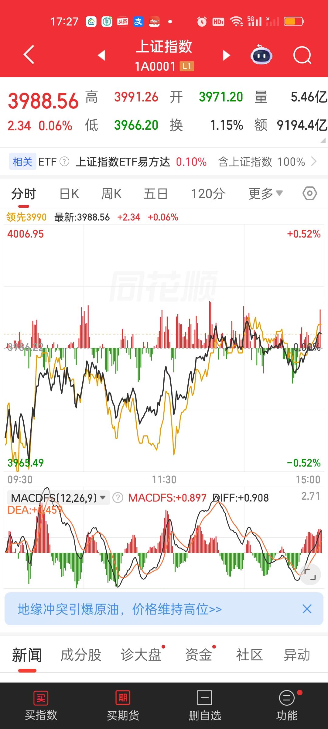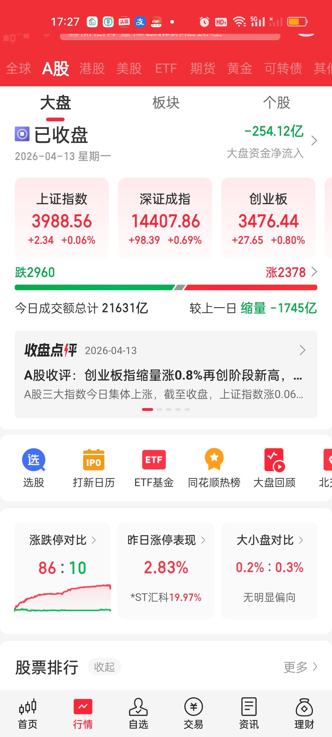 收盘了,和中午收盘相比最大的变化是成交量在下午继续缩了1745-998=747亿,但大盘资金反而净流入了335-254=81亿。下午上涨家数也增加了600家,涨跌停比也从59:9变成了86:10,涨停家数增加了27家,跌停家数只增加1家。从这个江角度讲,今天算是低开高走了。但赚钱效应是不是真的那么强,这个要仁者见仁智者见智了。