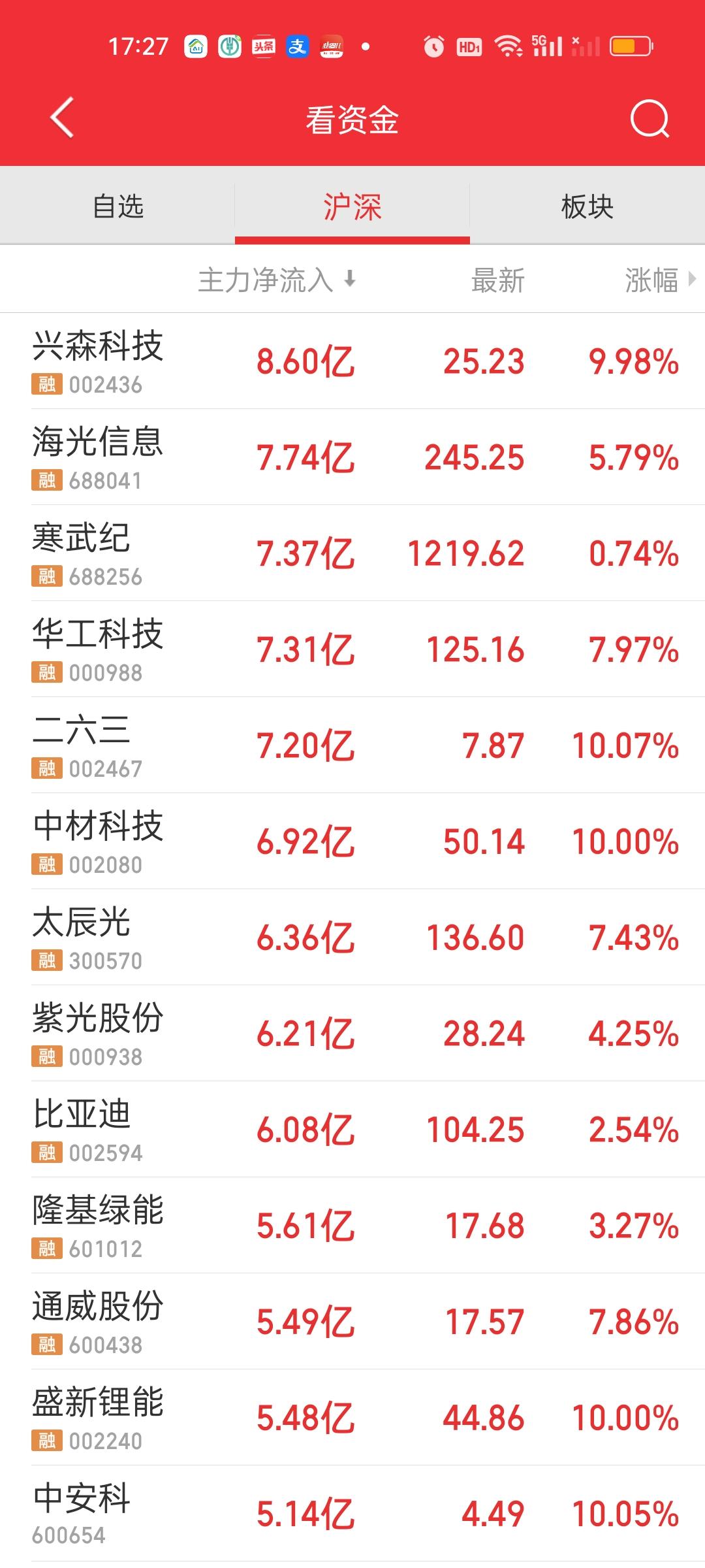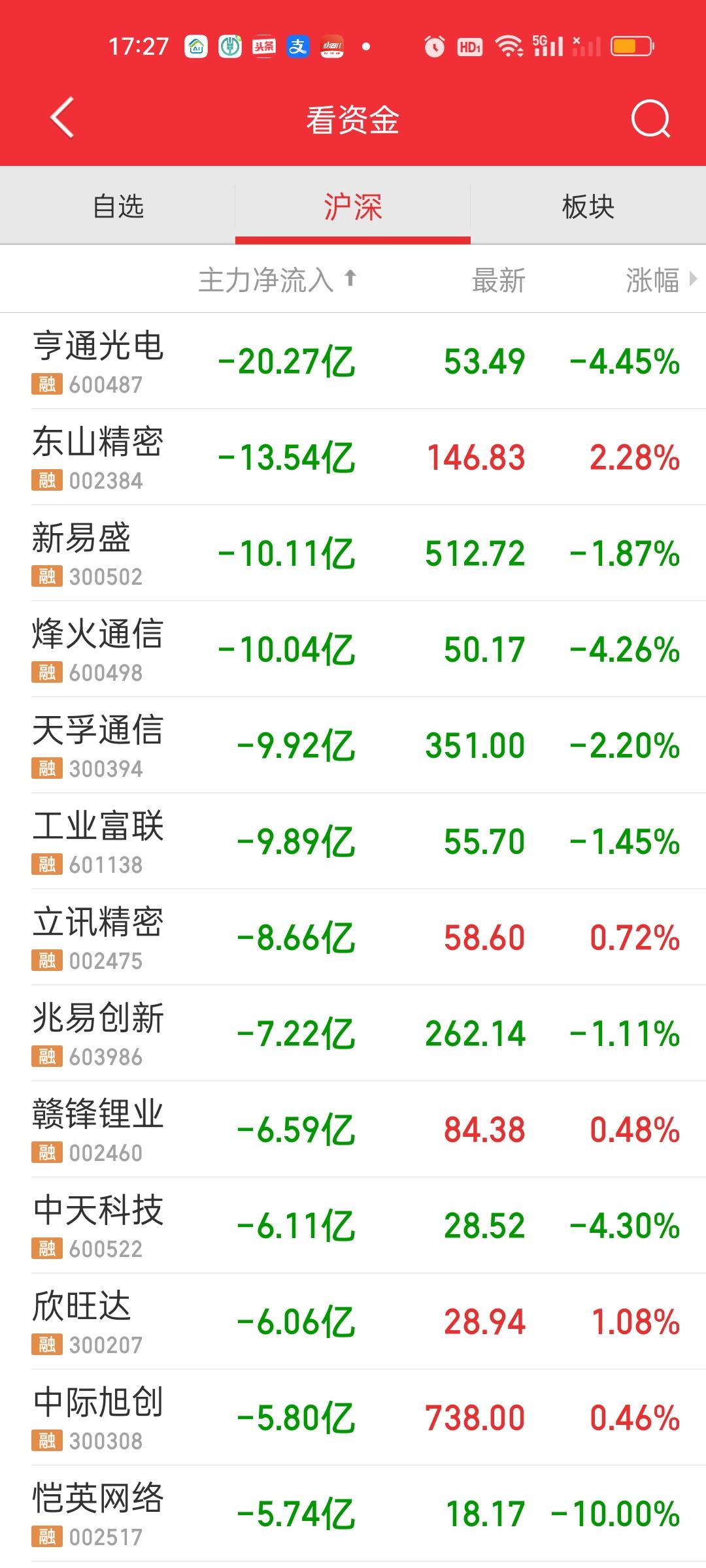 依旧没有主力资金净流入超过10亿的个股,但净流出资金超10亿的个股在亨通的基础上增加了三只,东山精密,新易盛和烽火通信,天孚通信和工业富联也很接近。