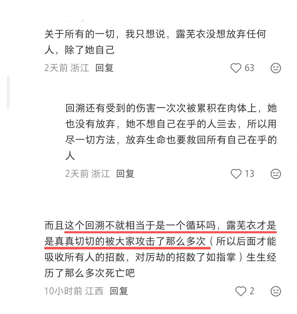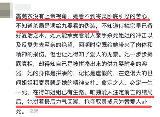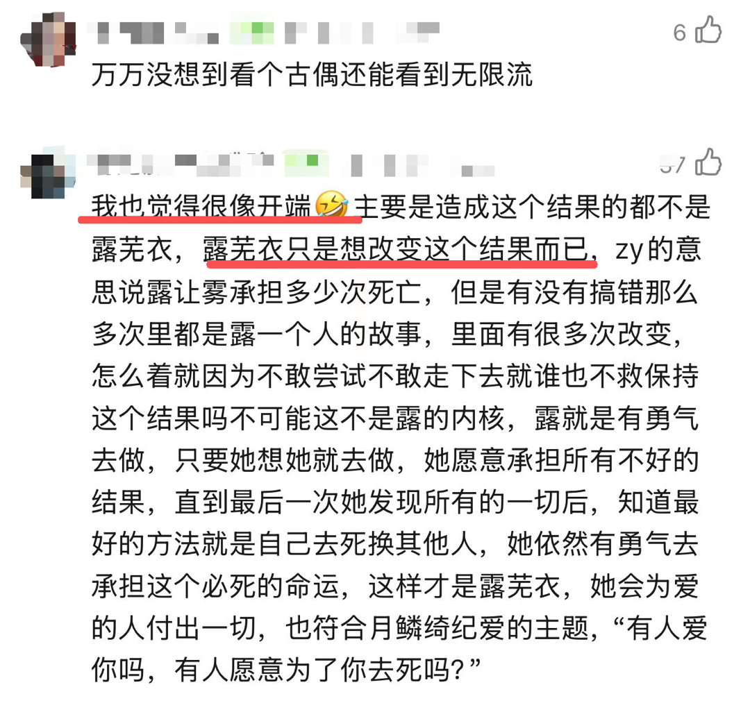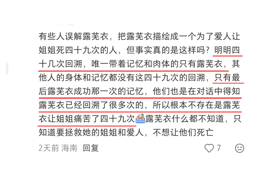 所以是露芜衣一个人经历了49次回溯,其他人没有记忆所以他们承受的痛苦始终有且仅有记忆存在的最后一次,姐姐爱人都已经被拯救下来了。只有露芜衣拥有全部的记忆,承受了所有心理和生理上的痛苦😖用自己的身躯为救姐姐和70回溯,好痛!网友用开端类比月鳞绮纪的回溯剧情,一下子就看懂了