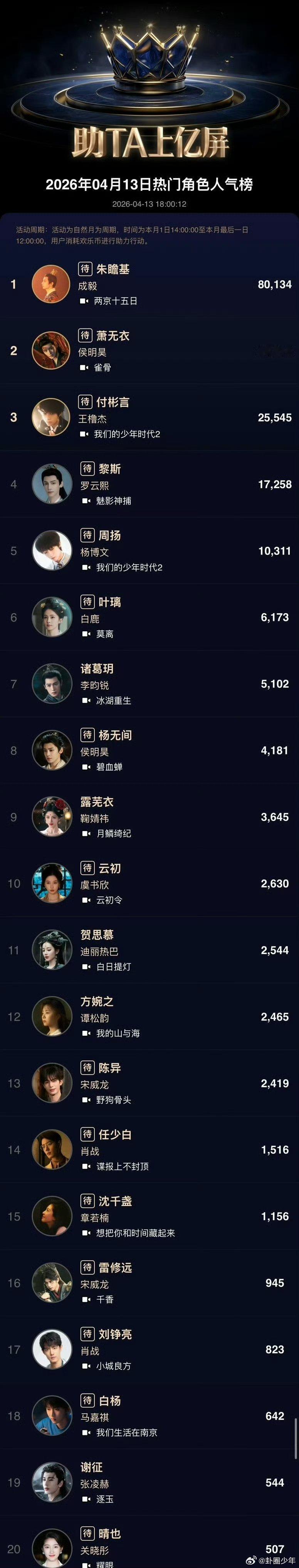 热门角色人气榜前三热门角色人气榜TOP3欢网大数据热门角色人气榜TOP3实力登场,成毅、侯明昊、王橹杰三位演员演技在线,角色塑造力拉满,每一位都极具看点!