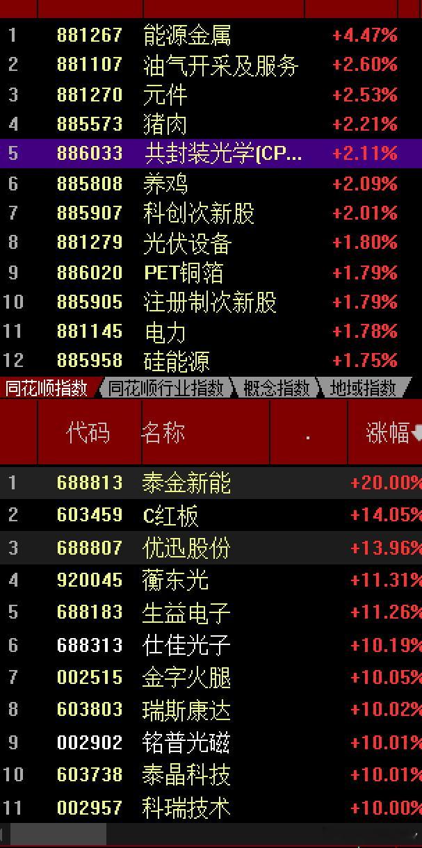 周末美伊谈判失败,符合预期的,没啥大不了的,可川普突发神经,封锁海峡,市场美伊局势升温,引发原油大涨,所以早上日韩股市走的弱不过我们大A今天还是坚韧的,只影响了开盘,在低开15个点后,稍微下探一下就被CPO光模块,半导体存储芯片等题材情绪拉起来,午后能源金属,锂矿发力,拉出了3991点,逼近4000点,不过压力明显,最终收红,一根小阳线3988点,在海峡关闭,油价暴涨下,能这么坚挺,比想象着好点的,强于预期但科创50更强,早上一度红2%以上,宁德时代大涨,把创业板指数刷了3492点,五年来新高,平台突破,有点走出趋势味道虽然几大指数均红,但分化局势明显,红2300多家,绿近3000家,涨停86家,跌停10家,人气情绪效应还是看科技逻辑量能2.1万亿多,比昨天减少1700多亿,不少于2万亿还可以了今天热点在两个点,一个是“光”光通信,CPO光模块,pCB概念,及存储芯片半导体,通信设备,是近段时间的热门所在,“易中天”等部分历史新高,源捷科技拉出1322元历史新高,光迅,兴森,德名利太辰光仕佳光子,铭普光磁,生益科技,科瑞技术,国际复材,宏和科技,东田微中国巨石等股领涨,这个方向继续的挖掘,另一点,美伊局势引发的老美封锁海峡,引发的能源安全,更多的是能源金属,涉及到了涨价品种,锂矿锂电,固态电池,光伏设备,储能硅能源等替代能源,碳酸锂价格上涨,需求增长,,所以上周五介入的盛新锂能,今天上板了,融捷,石大胜华赣锋德方纳米,爱旭等品种的走高,不过需要注意板块轮动的节奏当下美伊局势影响力在减弱,指数围绕4000点-3950区域横盘震荡消化,做平台为主,本来想今天能到20日线的,没到就被拉起来了更多的是关注逻辑的重要性,抓核心赛道,主要矛盾,注意轮动就好,别追高低吸关注季报年报披露