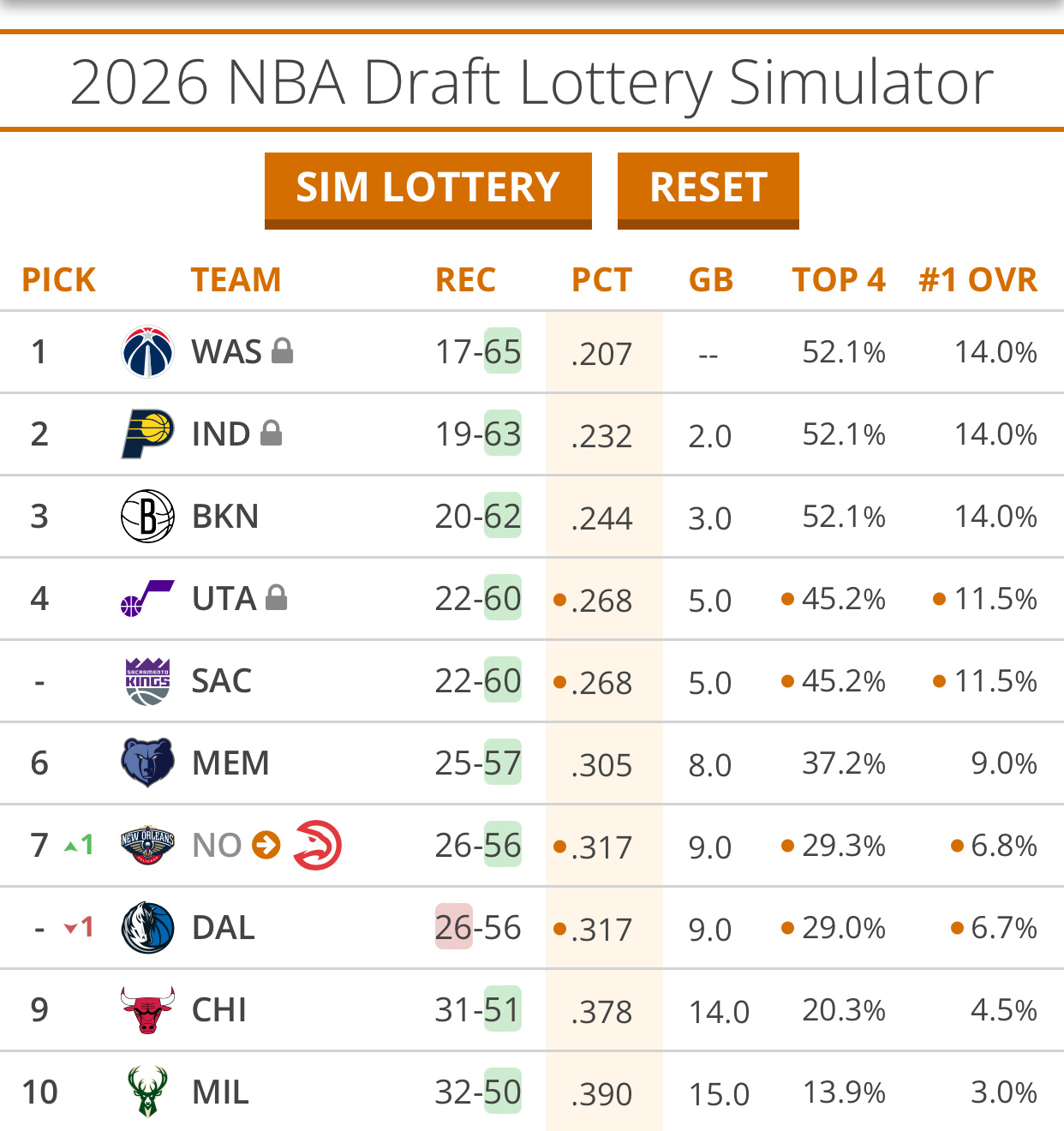 华盛顿奇才 战绩17胜65负,百分之14的概率得到状元签,前四顺位百分之52.1印第安纳步行者 战绩19胜63负,百分之14的概率得到状元签,前四顺位百分之52.1布鲁克林篮网 战绩20胜62负,百分之14的概率得到状元签,前四顺位百分之52.1犹他爵士 战绩22胜60负,百分之11.2的概率得到状元签,前四顺位百分之45.2萨克拉门托国王 战绩22胜60负,百分之11.2的概率得到状元签,前四顺位百分之45.2孟菲斯灰熊 战绩25胜57负,百分之9的概率得到状元签,前四顺位百分之37.2亚特兰大老鹰(去年因为一个大个新秀,鹈鹕把今年的选秀权给了老鹰)战绩46胜26负,百分之6.8的概率得到状元签,前四顺位百分之29.3芝加哥公牛 战绩31胜51负,百分之4.5的概率获得状元签,前四顺位百分之20.3密尔沃基雄鹿 战绩32胜50负,百分之3的概率获得状元签,前四顺位百分之13.9