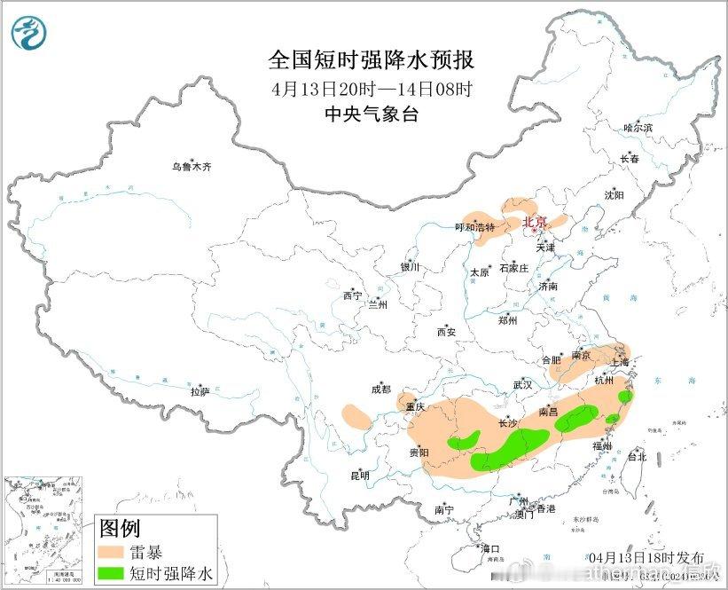 【强对流】预计4月13日20时至14日20时,湖南中南部、江西中部、浙江南部、福建西北部、贵州东南部、广西东北部等地的部分地区将有短时强降水天气,小时雨量20-40毫米,局地可达50毫米以上;另外,山西中部、河北西部和北部、湖南南部、江西南部、福建西部、贵州东南部、广西东北部等地的局地将有雷暴大风或冰雹天气。