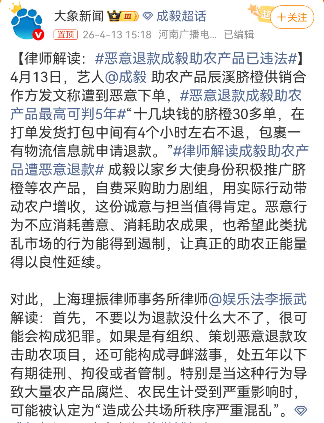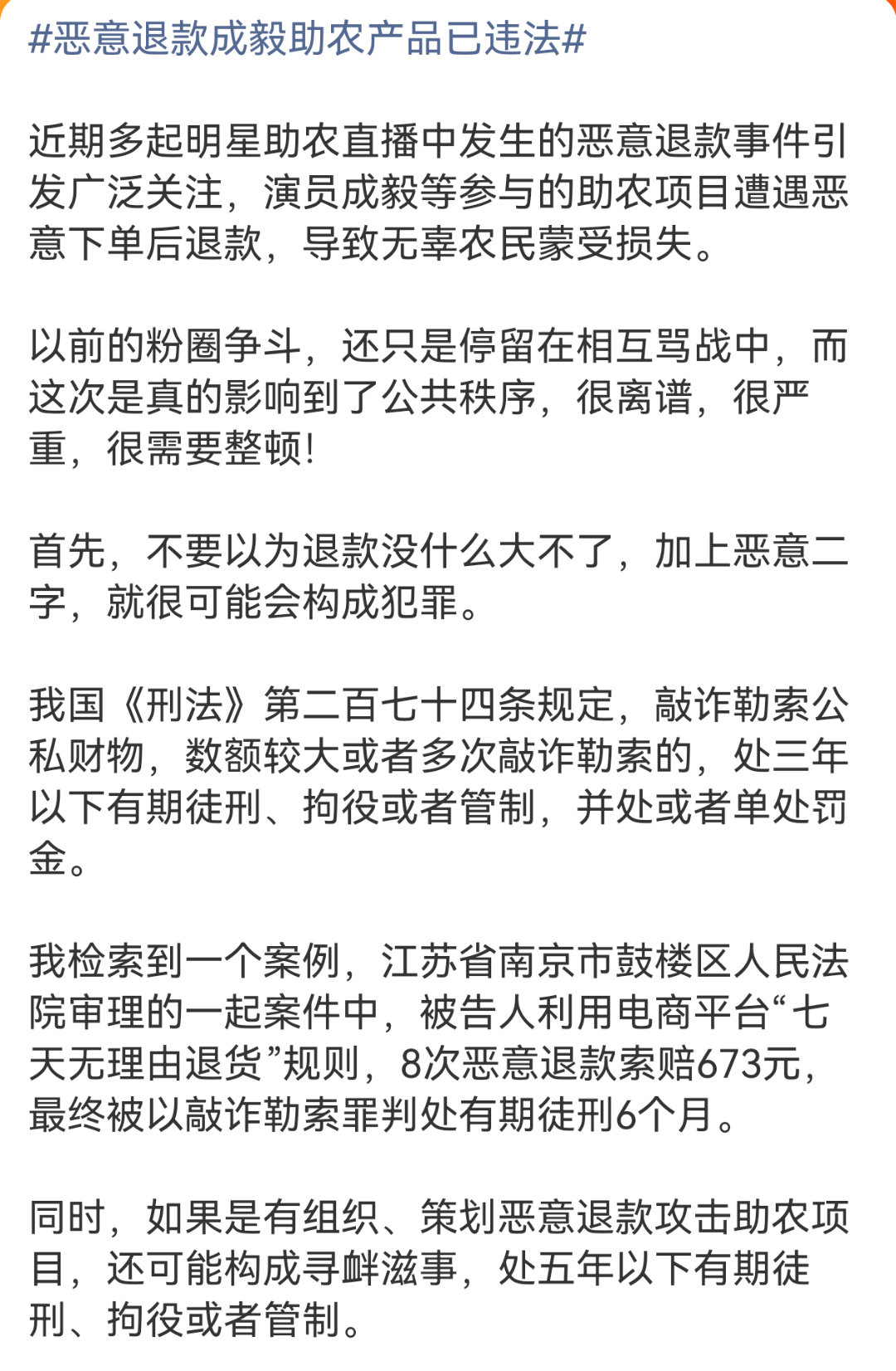 律师解读恶意退款成毅助农产品已违法 恶意退款成毅助农产品已违法