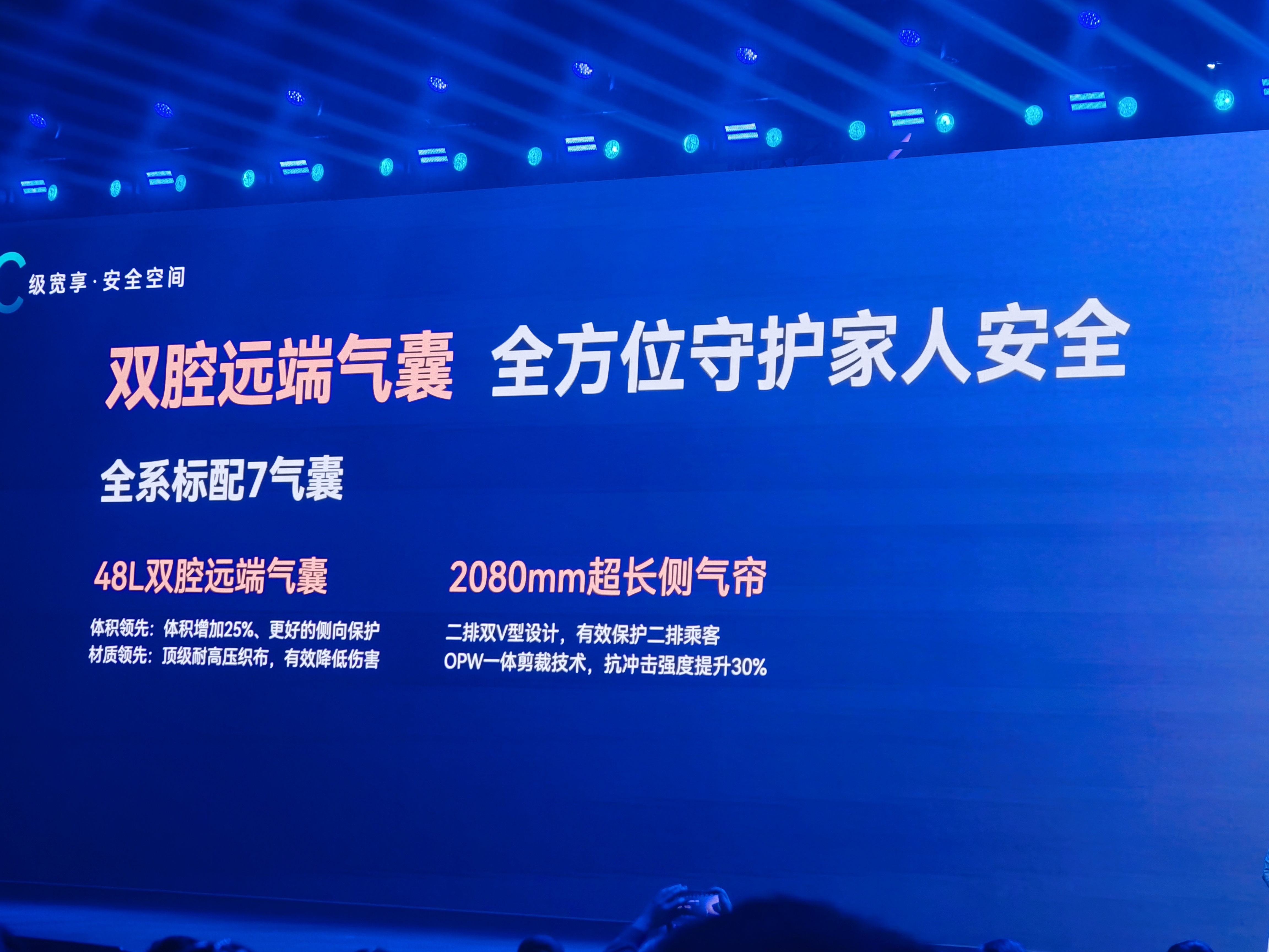 被动安全方面,全系标配7气囊,48L双腔远端气囊体、2080mm超长侧气帘覆盖二排,从前排到后排,无死角守护