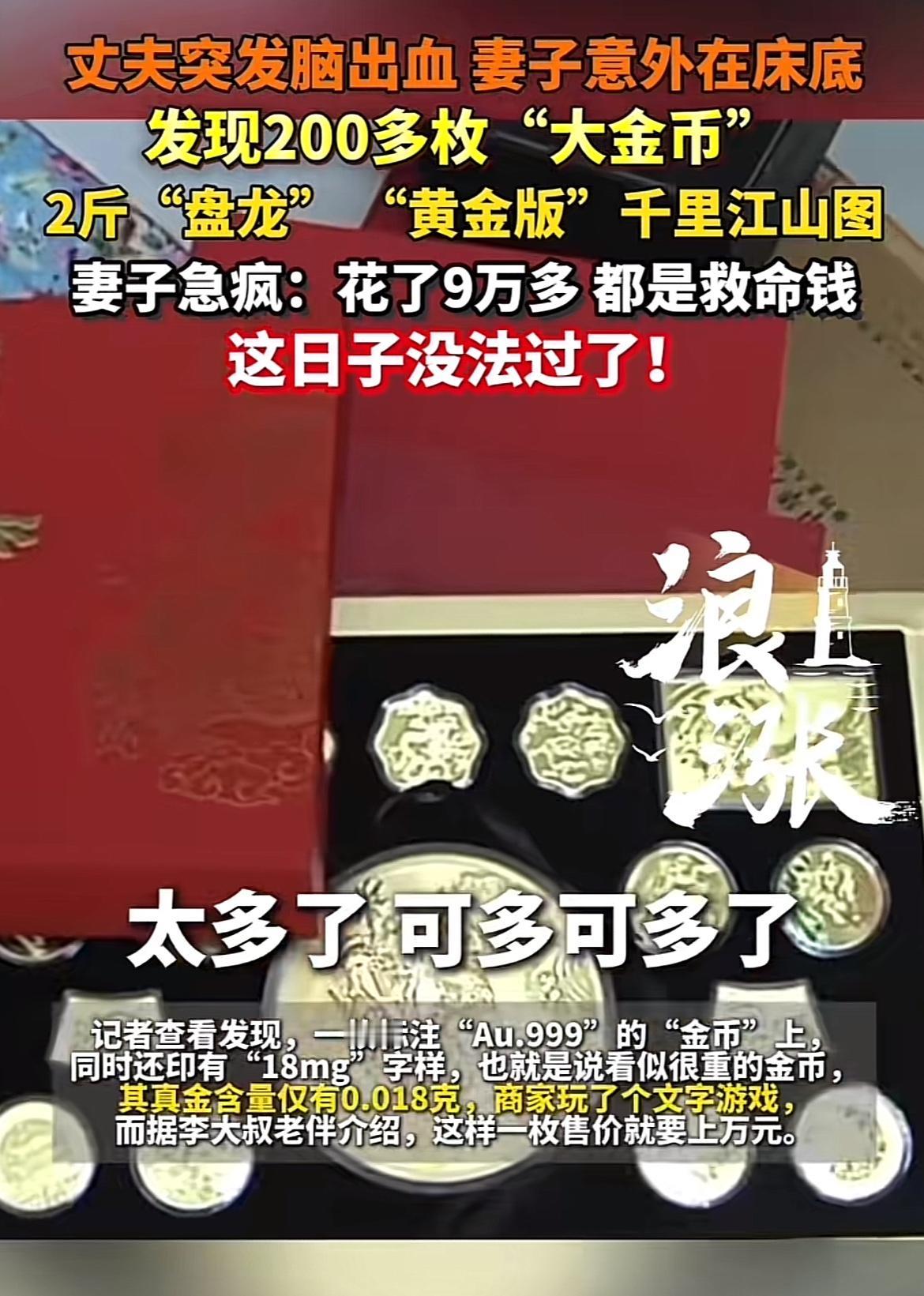 河南的李大叔突发脑出血生活不能自理,他老伴照顾他时,竟在床底发现200多枚“大金币”。本以为是巨额财富,结果却是噩梦。这些“金币”包装精美,很多标着“Au.999”,有的单个重达2斤,可仔细一看,一枚“金币”真金含量仅0.018克,商家玩文字游戏坑人。撬开后发现质地硬,里面是白色,明显是假货。李大叔网购这些花了9万多,他还曾说能回收卖大钱。现在老伴急疯了,这可是救命钱。她已提交退货申请,平台客服说会处理,但钱能不能追回来还是未知数,这日子真让人糟心!