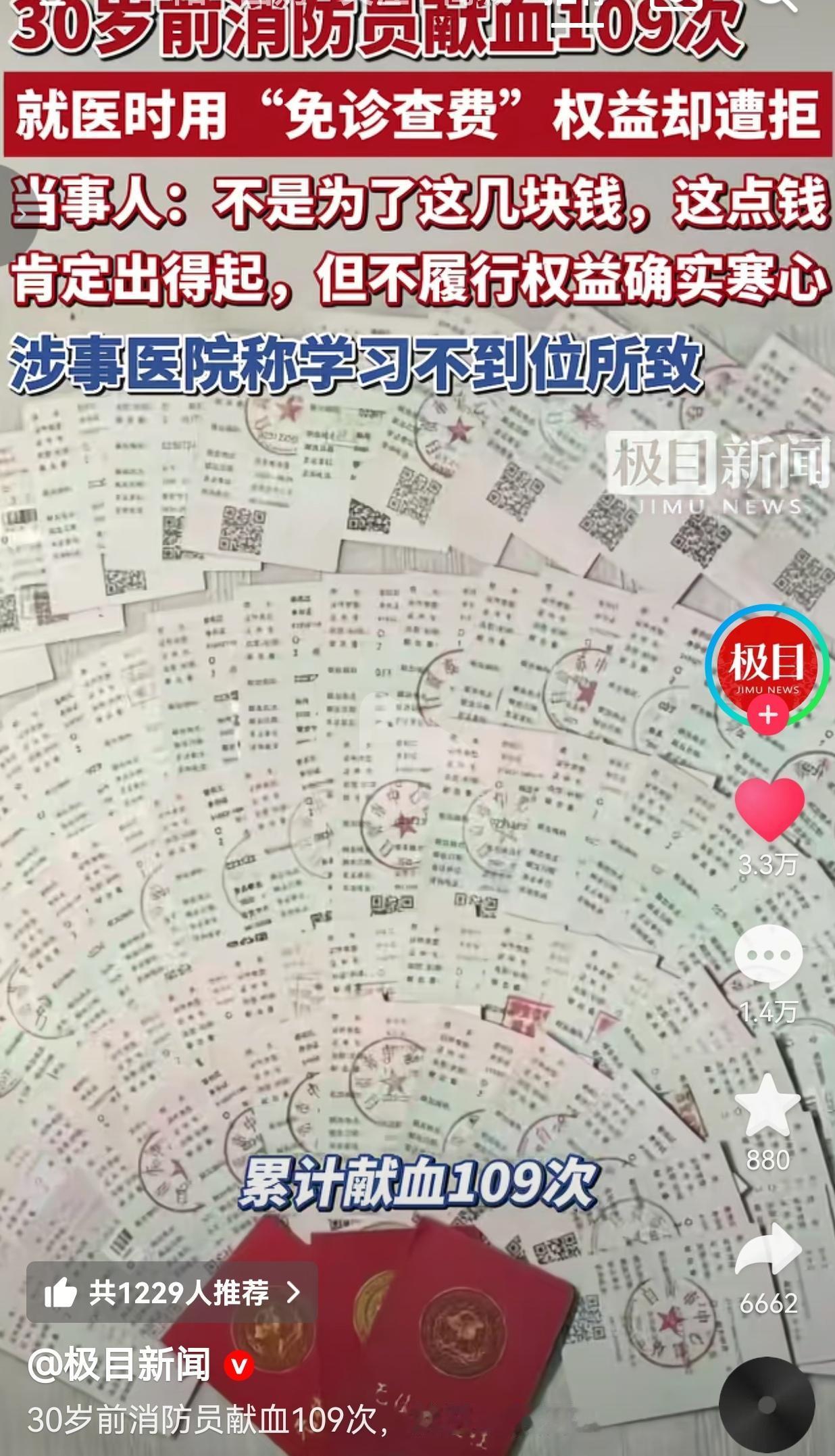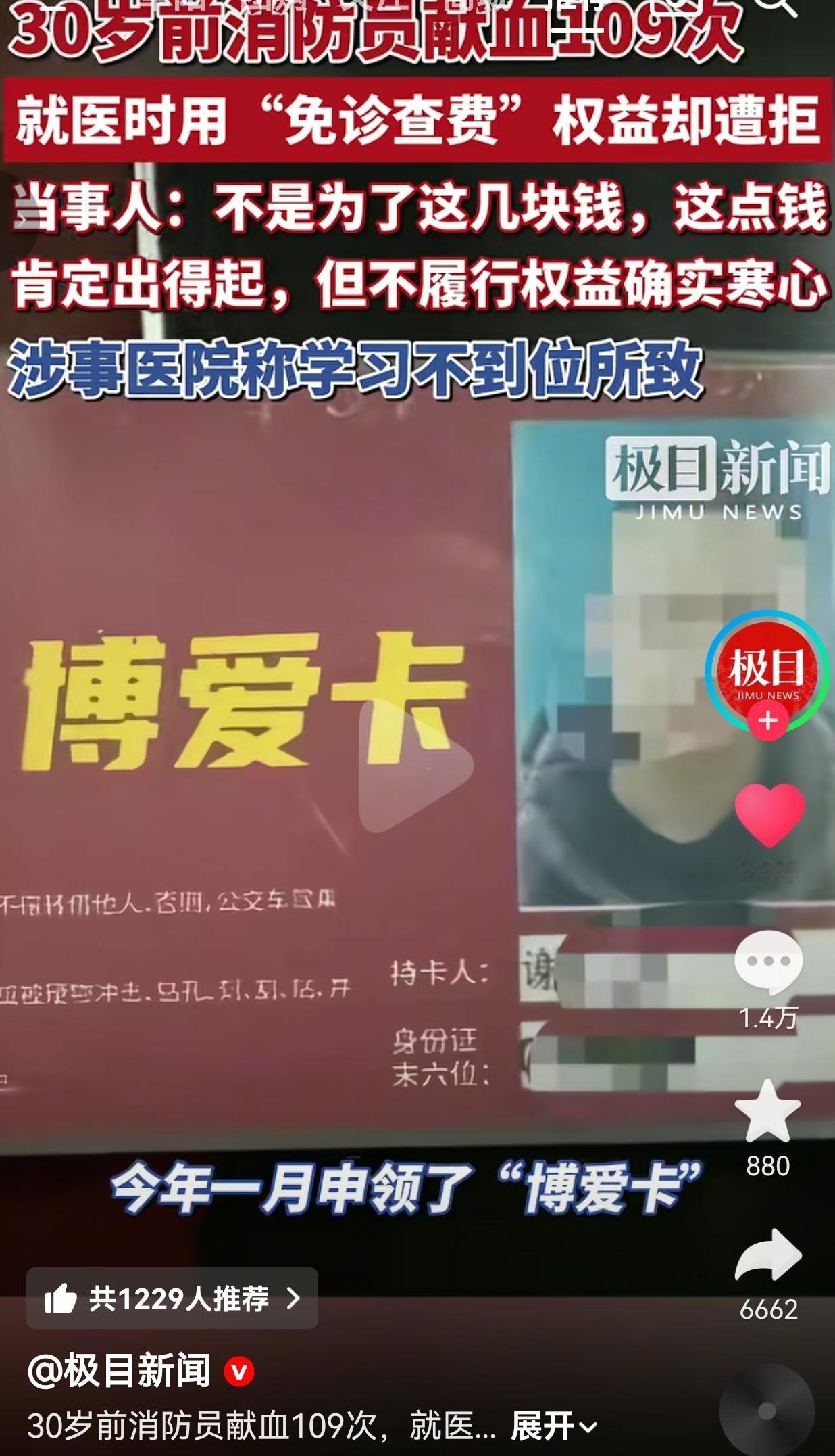 太令人寒心了!四川自贡前消防员谢先生,30岁前无偿献血109次、累计近4万毫升,拿着国家给的“博爱卡”去荣县人民医院就医,就想免个门诊诊查费。