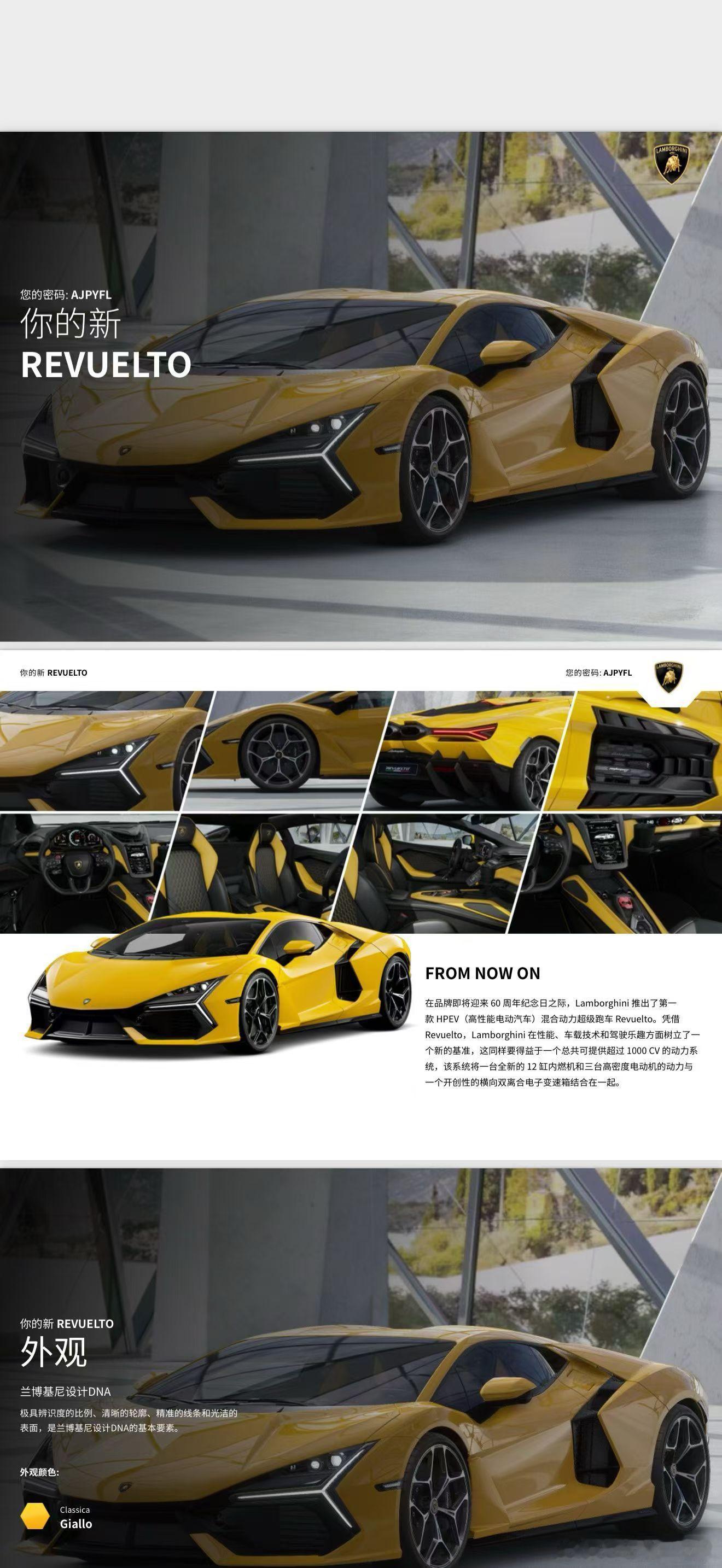 兰博基尼Revuelto 6.5L PHEV标准型,仅1000公里准新巅峰态 。V12自吸与三电机迸发1016匹狂暴之力,2.5秒破百,极速超350km/h。剪刀门启合间,是意式传奇与混动科技的共鸣 。全车碳纤维单体壳,准新车况完美如新,随时上牌、过户无忧。人生总要有一次,为热爱不留遗憾。寻真正伯乐,执掌这头千匹蛮牛,让每一次轰鸣,都成为你突破平庸的勋章 。