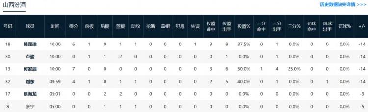 山西:何家辰7分,韩霈瑜6分1篮板1助攻。