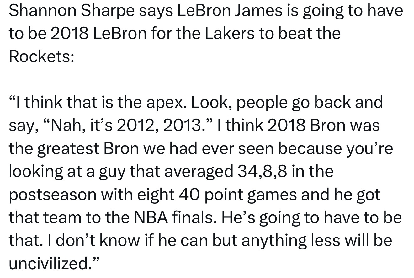“我认为那是他的巅峰。你看,有人会说‘不,应该是2012年或2013年’,但我觉得2018年的勒布朗才是我们见过的最强版本。那一年季后赛他场均34分8篮板8助攻,有8场得分40+,硬是把那支球队带进了总决赛。他必须打出那样的表现。我不知道他还能不能做到,但任何低于那个水准的表现都令人难以接受。”