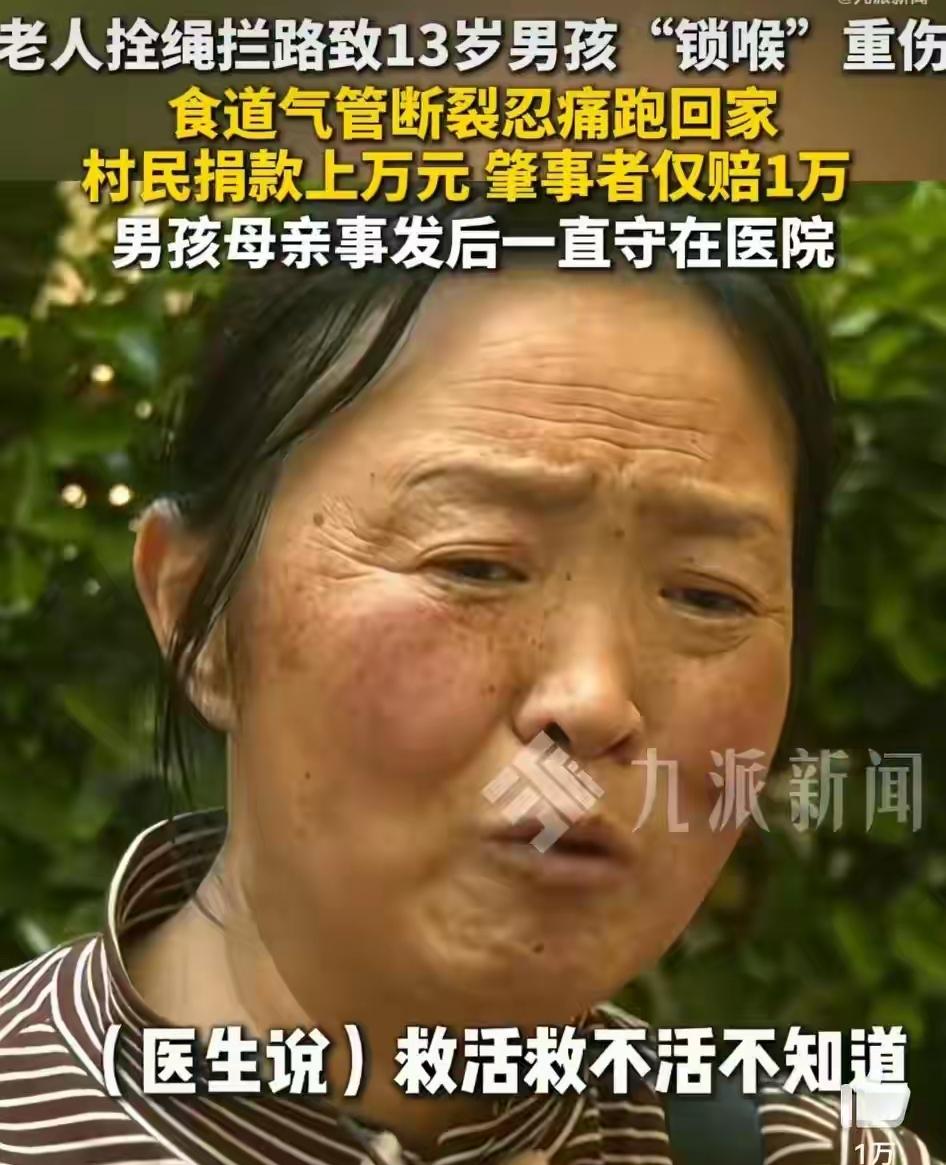 拉绳子致男孩气管喉管割断的老人今年70多岁了,患有脑梗,平时走路也不方便,4月4日这天为了方便打玉米在马路中间拉了一根绳子,致男孩受伤至今未脱离ICU,真的是太可怜了。
