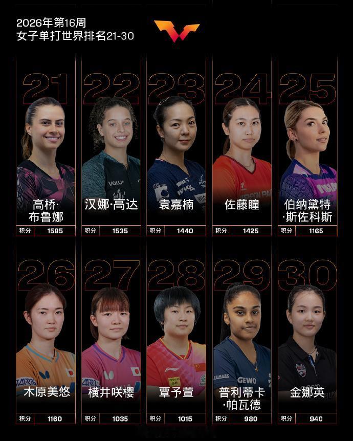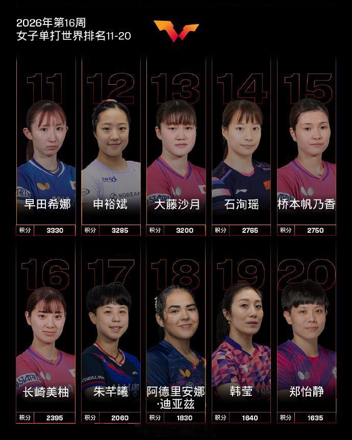 女子单打,中国队球员孙颖莎、王曼昱、陈幸同、蒯曼位列前四,陈熠位列第七,王艺迪位列第八。WTT常规挑战赛太原站女单四强石洵瑶排名上升1个名次位列14;八强平野美宇排名上升5个名次位列31;八强朱梓予排名上升15个名次位列80,刷新个人职业生涯排名新高;WTT支线赛卡帕多西亚站女单冠军冈田琴菜排名上升194个名次位列151,刷新个人职业生涯排名新高;四强伊莲娜·扎哈里亚排名上升19个名次位列99;杨晓馨排名上升13个名次位列98。