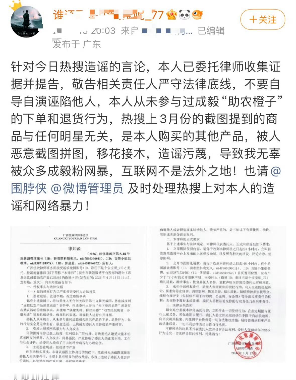 热搜上被移花接木造谣退款的素人朋友已经在维权了,已经委托律师取证造谣辱骂她的人,我支持素人拿起法律武器维护自身权益!