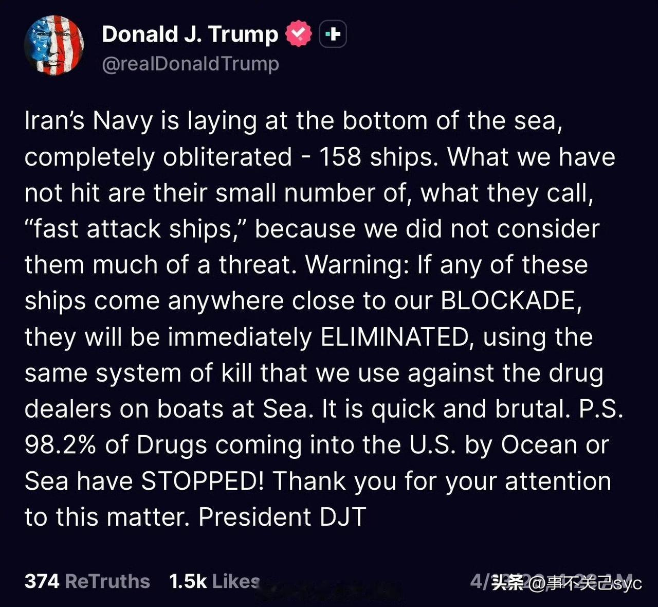 特朗普再发帖:“伊朗海军现在已经沉在海底,被彻底摧毁——158艘舰船全灭。我们唯