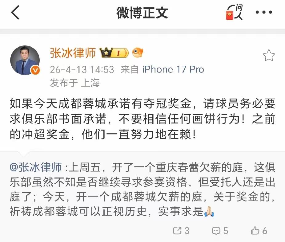 在蓉城兴高采烈庆祝一场逆转之际,这个“张冰律师”竟然用非法律思维“如果……那么……”推测开来,还用“不要相信……”的离间语言,在球员和俱乐部之间使坏。