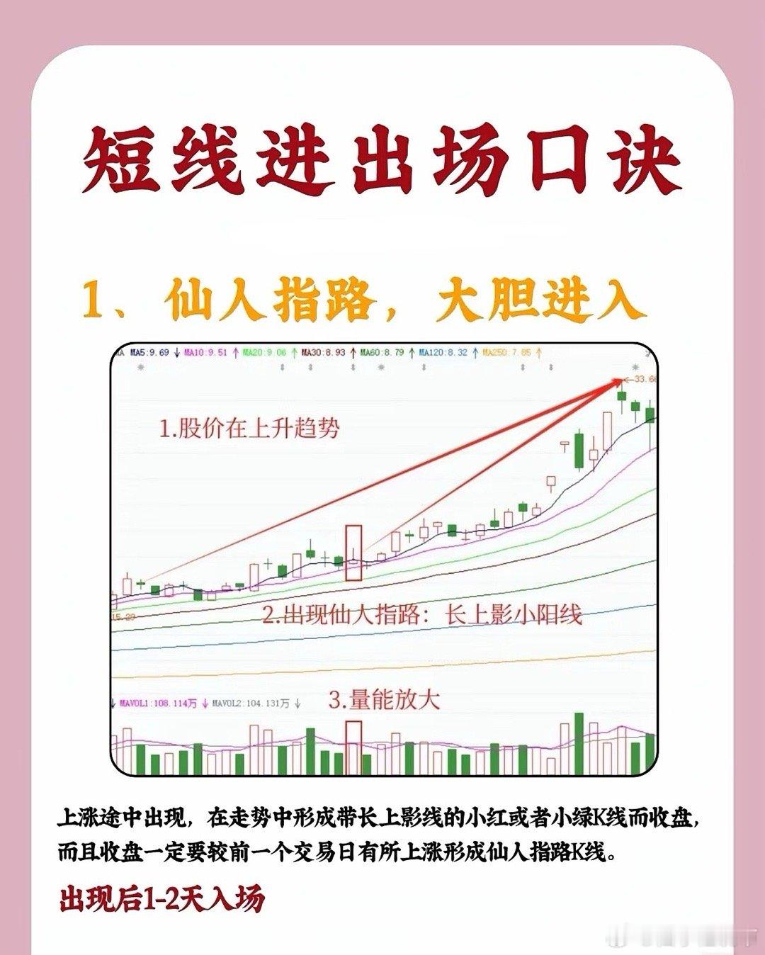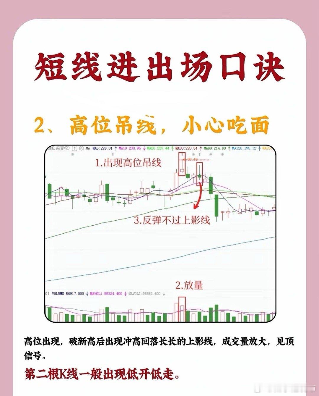 短线进出场口诀1、仙人指路,大胆进入股价处于上升趋势中时,若出现带长上影线的小阳线或小阴线(即“仙人指路”K线),且当日收盘价较前一日上涨、成交量明显放大,说明多头尝试向上突破后虽有回落,但承接力较强。该形态出现后,1 - 2个交易日内可择机入场,后续往往延续升势。2、高位吊线,小心吃面当股价在高位冲高回落,收出上影线极长、实体极小的K线(类似“吊颈线”),且成交量显著放大,同时后续反弹时无法突破该长上影线的顶端,这通常是见顶信号。次日K线往往低开低走,需及时止盈或止损,防范下跌风险(“吃面”即亏损)。3、双锤打桩,准备起涨若股价前期处于下降趋势或震荡行情中,底部区域出现两根下影线平行、底部价位相近的K线(即“双锤打桩”),且随后出现阳线确认,说明下方支撑强劲,多头开始发力。下影线越长,底部信号越强烈,后续行情大概率启动上涨。4、双峰触天,跌在眼前股价上涨至高位时,若出现两根(或多根)上影线平行、顶部价位相近的K线(即“双峰触天”),且出现阴线确认、成交量放大,意味着上方抛压沉重,多头无力突破,行情将转为下跌,需果断离场规避风险。(注:技术形态需结合大盘环境、个股基本面综合判断,请勿单一依赖口诀操作。)
