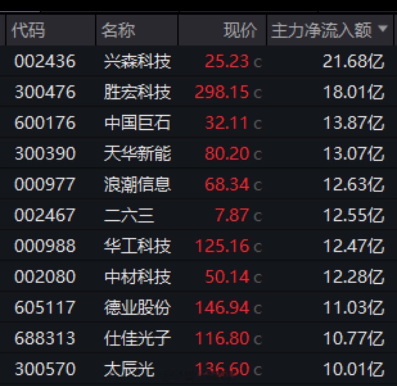 盘面上,玻璃玻纤、国防军工、新能源、养殖业等板块涨幅居前,游戏、医药生物、航运港口、贵金属等板块跌幅居前。Wind实时监测数据显示,电子行业获得逾84亿元主力资金净流入,计算机获得逾80亿元净流入,电力设备获得逾61亿元净流入,机械设备获得逾56亿元净流入,建筑材料、国防军工、汽车、公用事业等均获得超30亿元净流入。传媒、医药生物都遭主力资金净流出逾20亿元,交通运输净流出逾14亿元。个股方面,兴森科技获得逾21亿元主力资金净流入,胜宏科技、中国巨石、天华新能、浪潮信息等10股也获得超10亿元净流入。