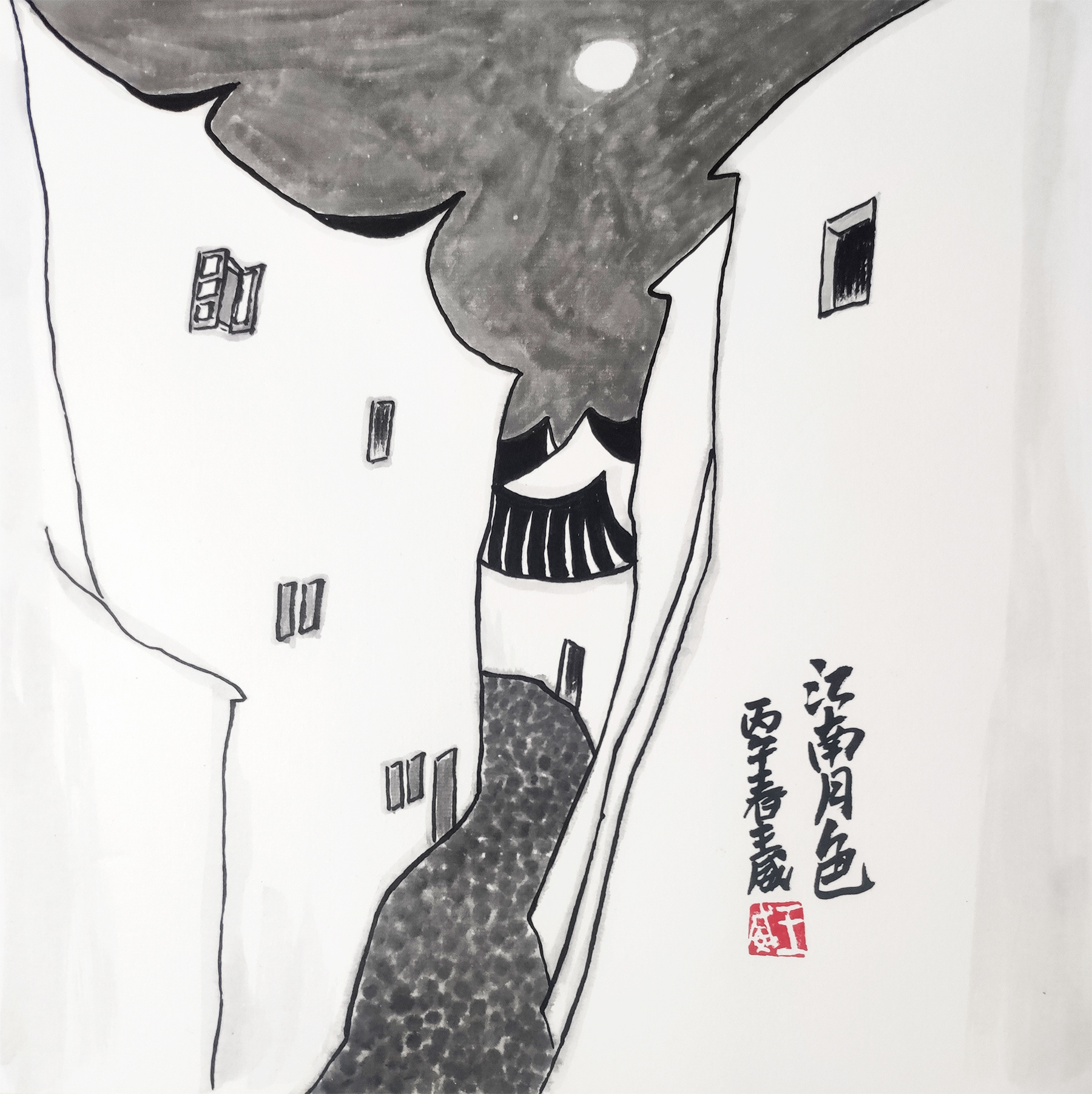 小画,那年那月,不谙世事的我第一次去江南,到达的第一个晚上,第一次走在江南巷子里,第一次见到白墙灰瓦和青石小路,那一夜头顶的月亮是那么的亮,至今仍记忆犹新。这就是中国风遇见艺术 江南月色