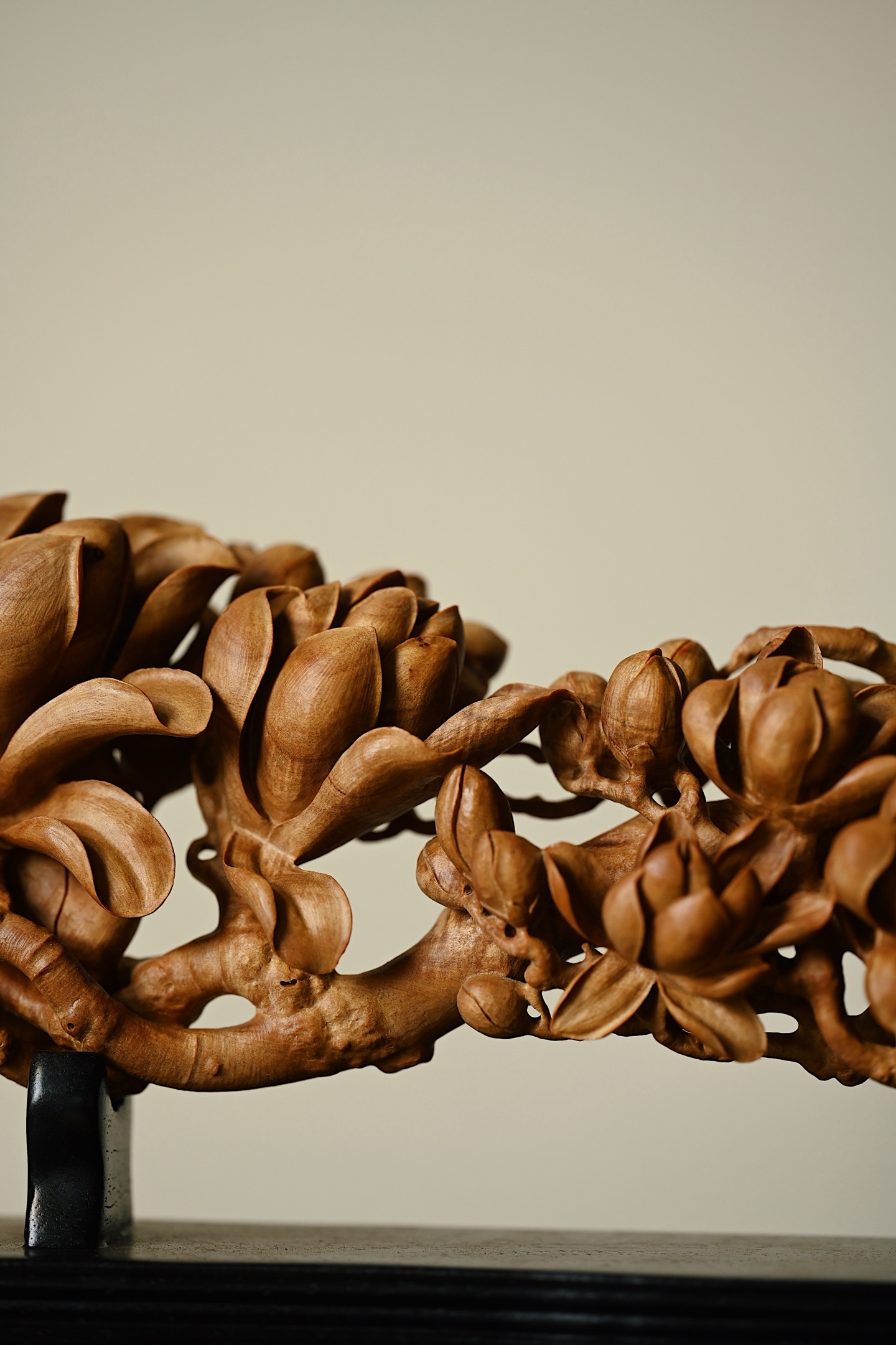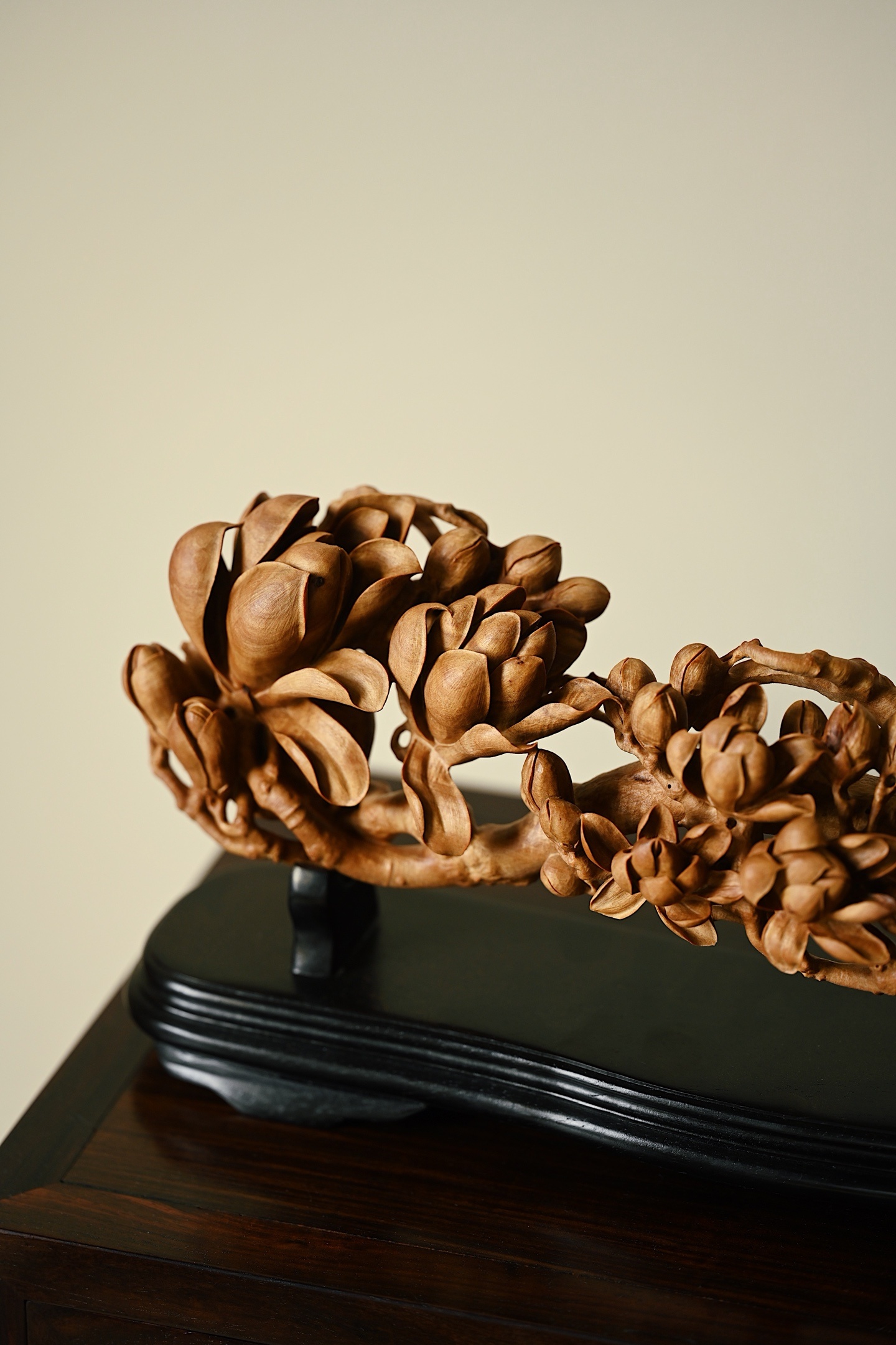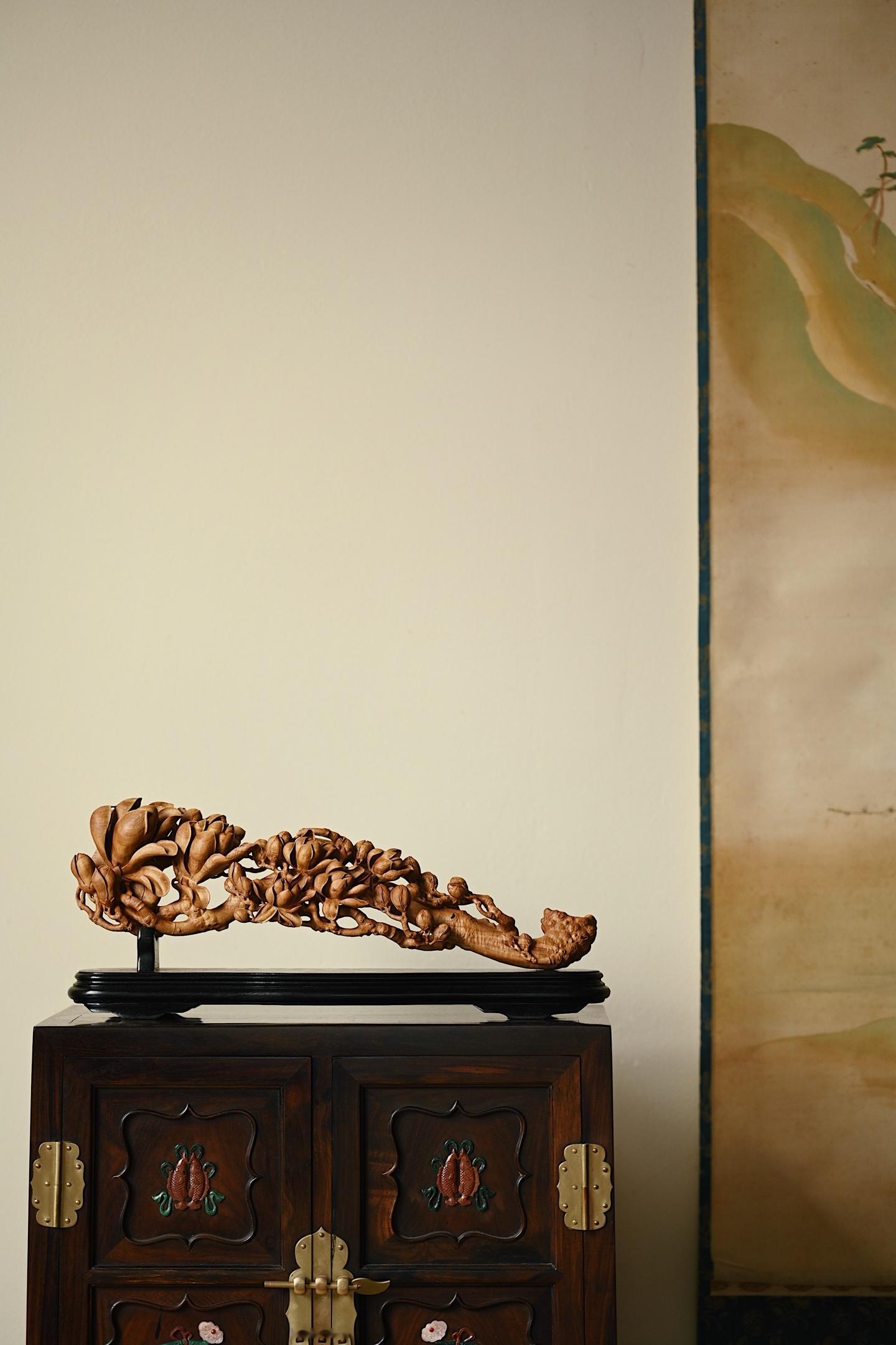 甄选老山檀香整料雕琢而成,木材质地坚密细腻,色泽温润,雕刻玉兰繁花满枝,或盛放、或含苞,花瓣层次分明,栩栩如生,枝干苍劲古朴,细节铺陈极尽精微,将“玉兰花放,满堂富贵”的美好寓意展现得淋漓尽致。