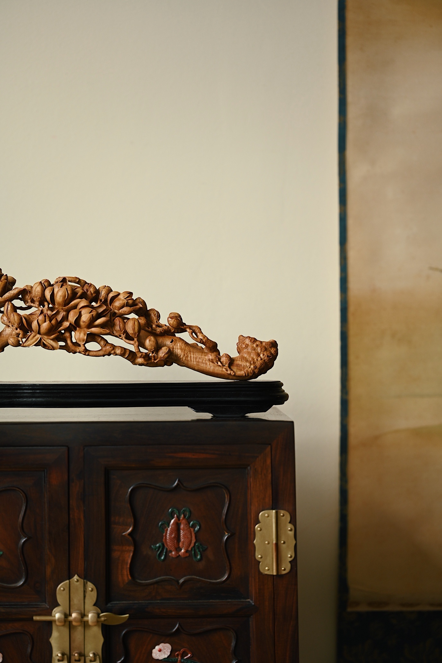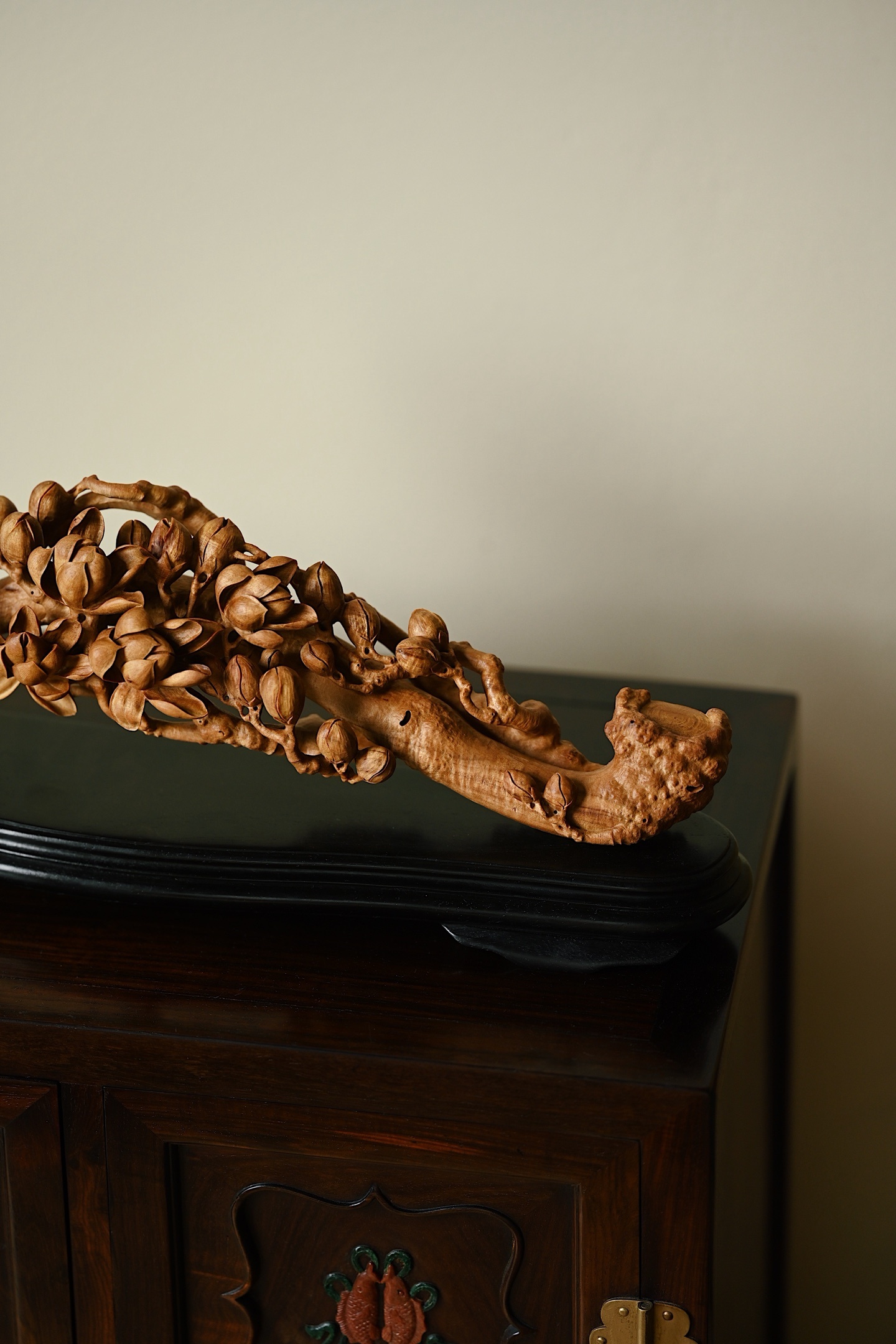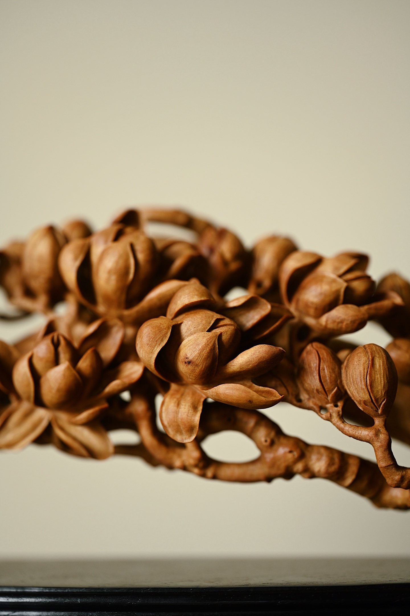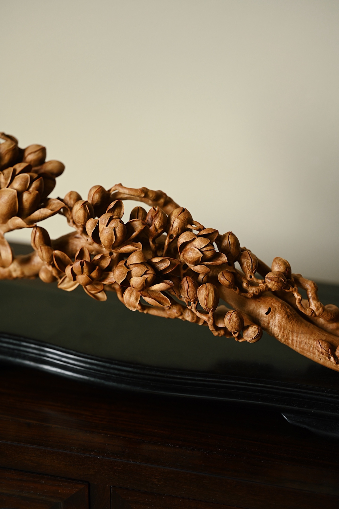 甄选老山檀香整料雕琢而成,木材质地坚密细腻,色泽温润,雕刻玉兰繁花满枝,或盛放、或含苞,花瓣层次分明,栩栩如生,枝干苍劲古朴,细节铺陈极尽精微,将“玉兰花放,满堂富贵”的美好寓意展现得淋漓尽致。