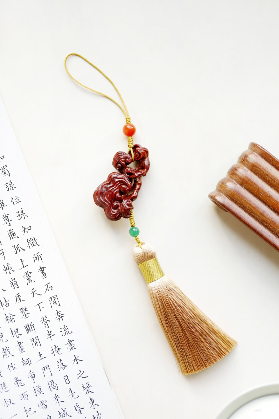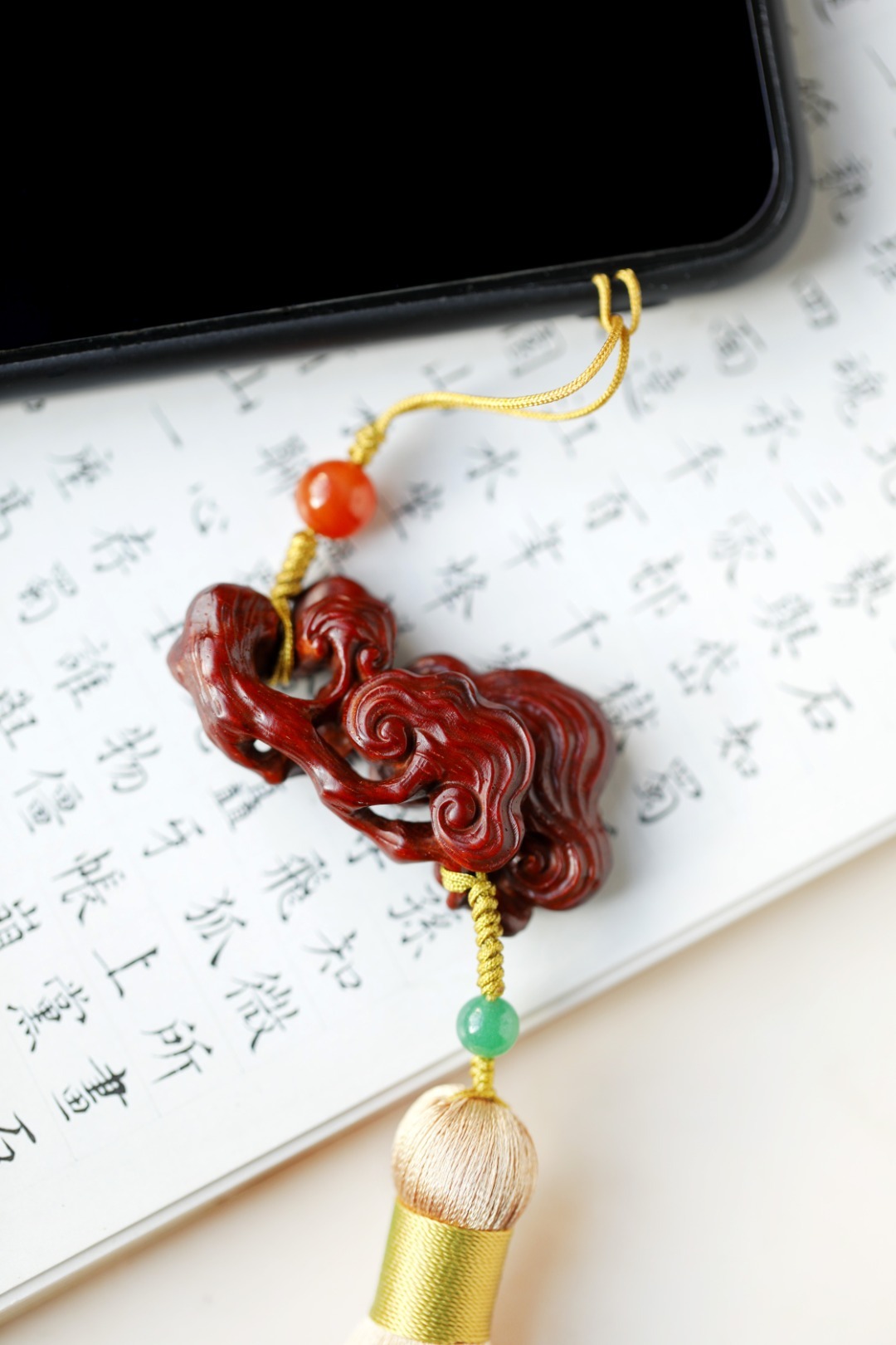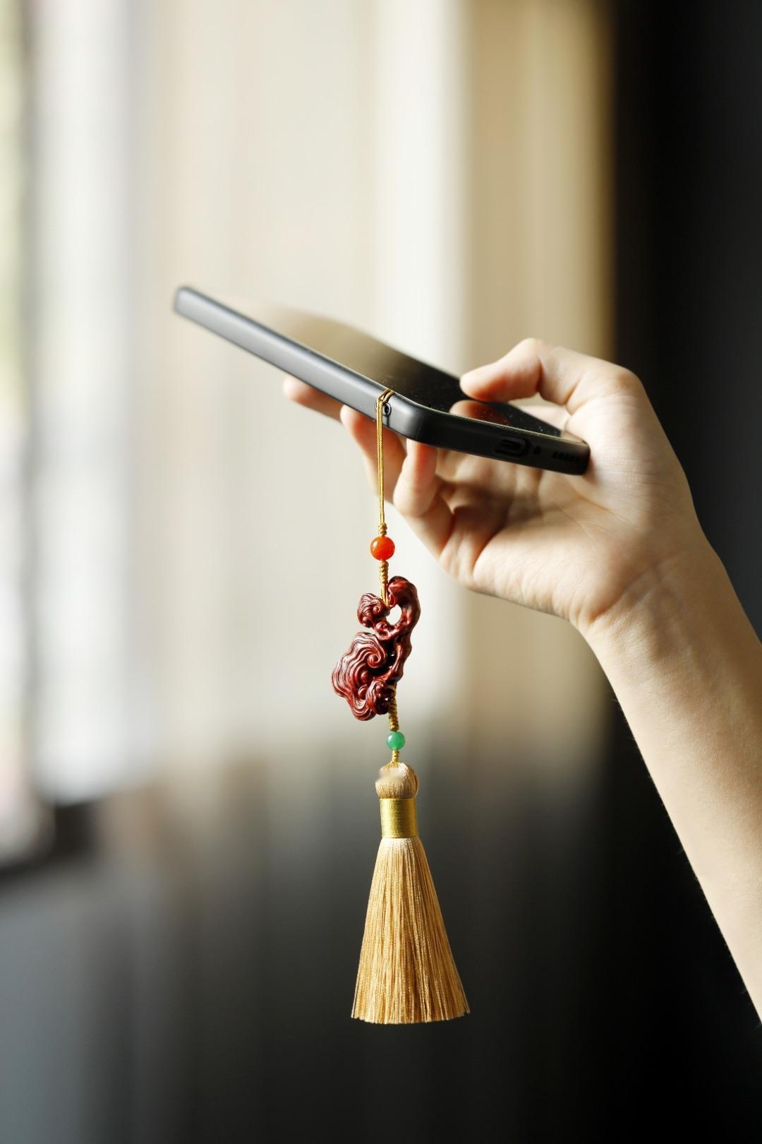紫檀木老料镂雕,灵芝数朵,象征吉庆祥和、祥瑞福祉,配以宫廷风流苏,古趣盎然!