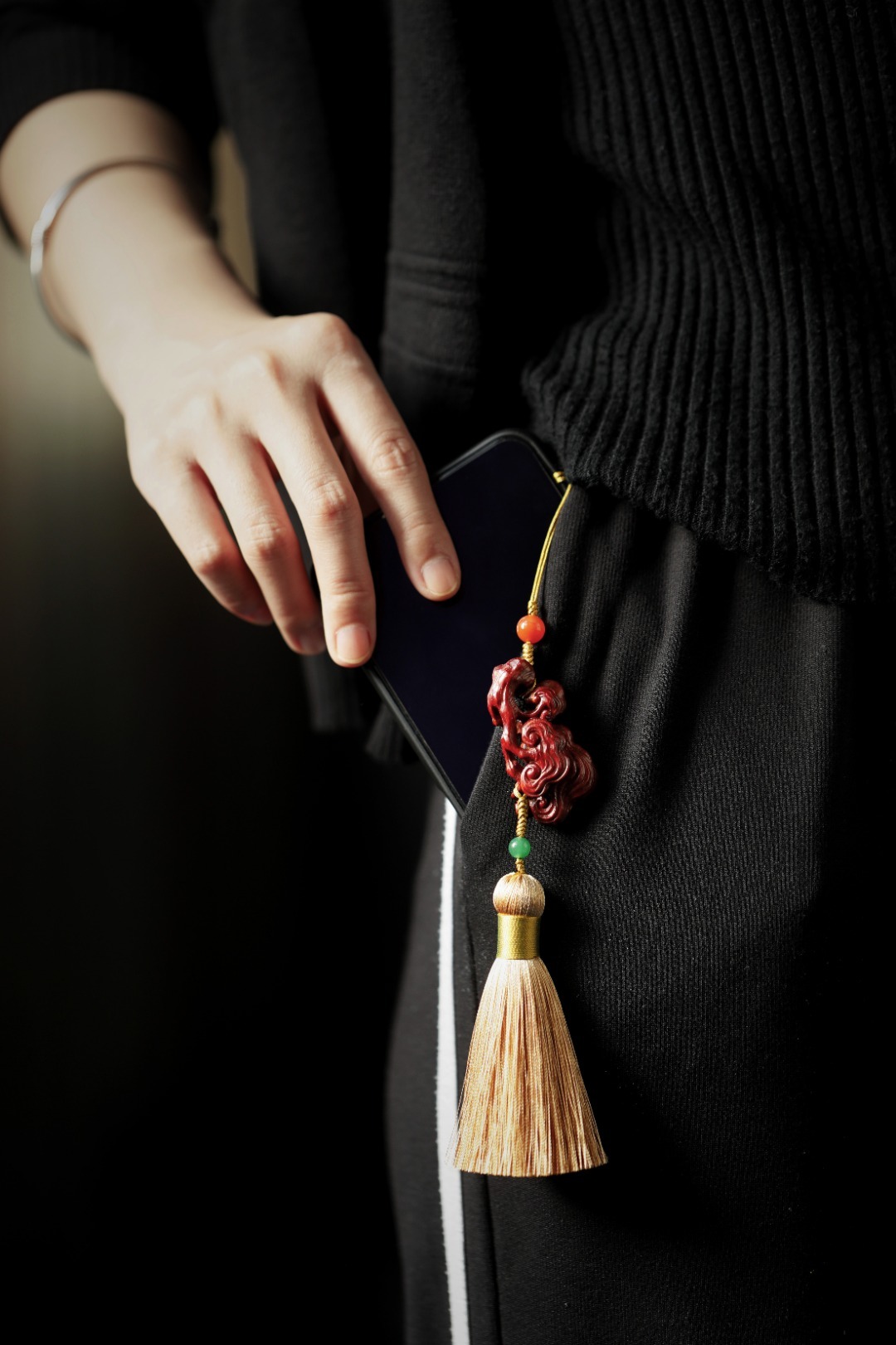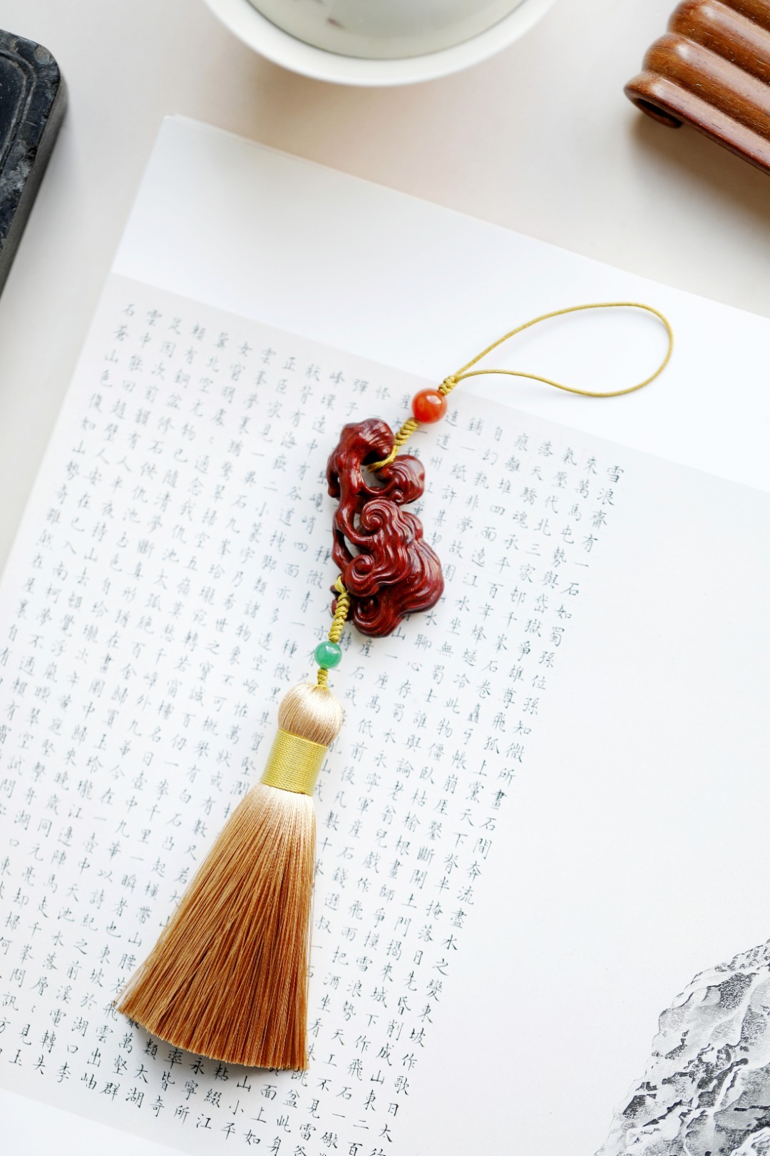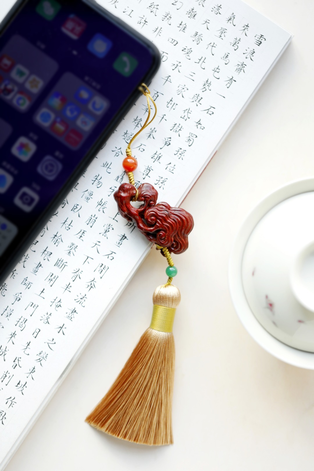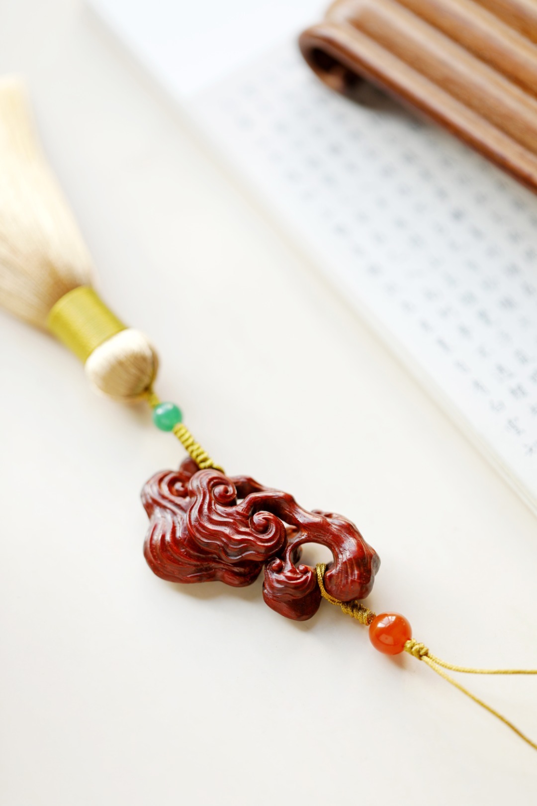 紫檀木老料镂雕,灵芝数朵,象征吉庆祥和、祥瑞福祉,配以宫廷风流苏,古趣盎然!