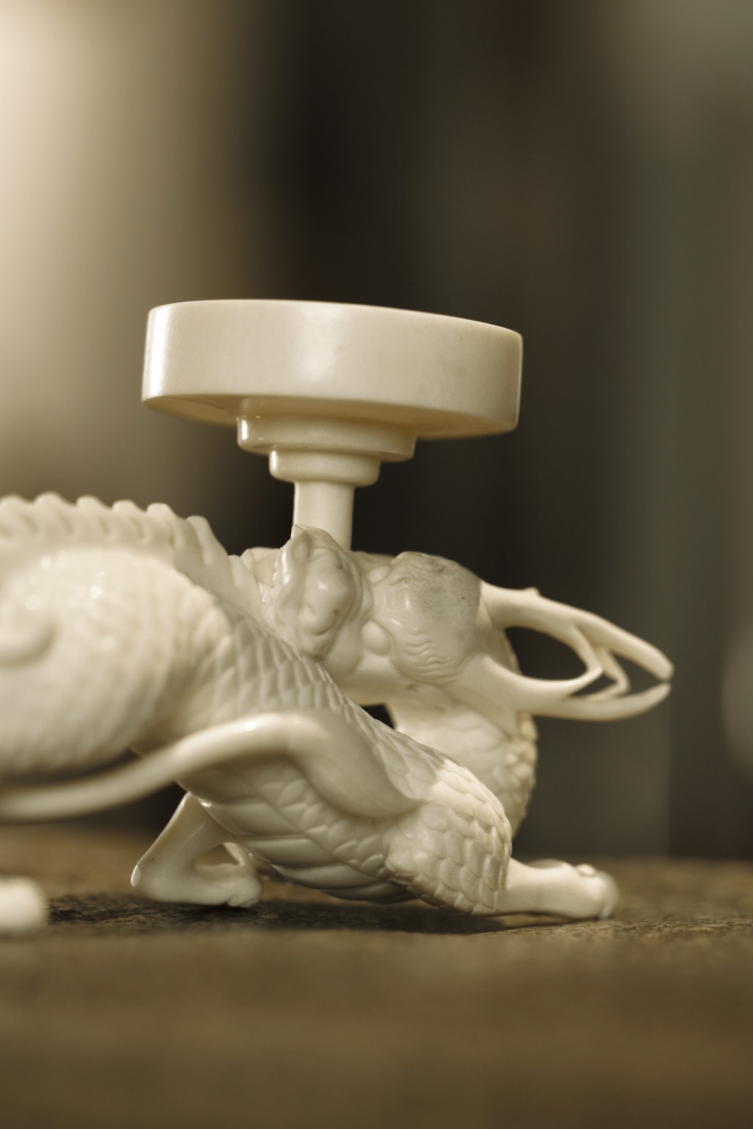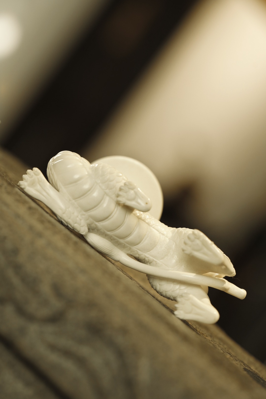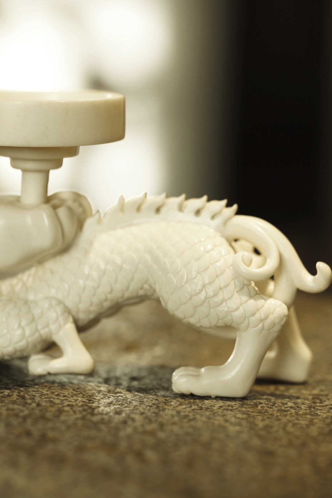 鹿角 | 狻猊·烛台整料手雕,技法洗练畅达,整材雕成,首尾贯连一气,神兽灵动有神