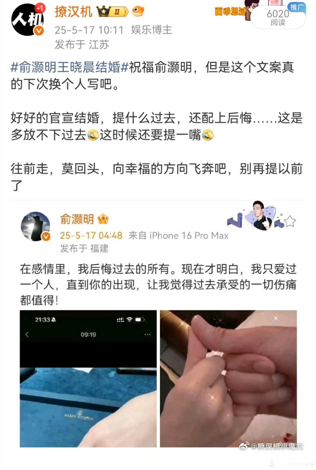 王晓晨 俞灏明当初官宣结婚俞灏明的文案就怪怪的这一年还没到呢……这两人咋了
