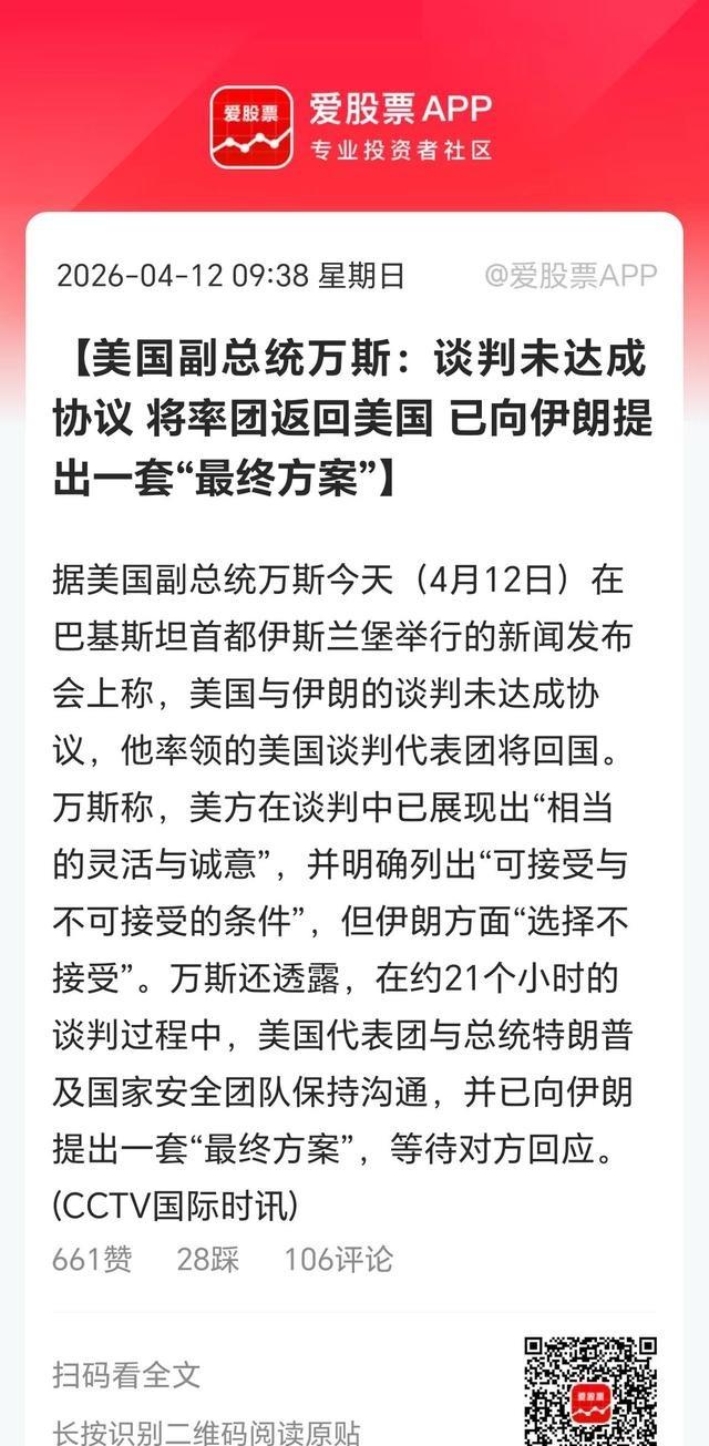 在我看来,这次美伊第一轮谈判没有达成协议,利弊需要分开看。坏处方面,停火协议的脆弱性增加,如果双方后续没有新进展,霍尔木兹海峡航运可能面临更大不确定性,原油价格容易反弹,这会推高全球能源成本,对依赖进口能源的经济体形成压力。A股下周可能因此受到短期拖累,尤其是石油化工、航空和部分制造业板块,风险偏好下降时资金会趋于谨慎,指数容易出现震荡或回谈判没有彻底破裂,双方都留下了继续对话的空间,美方提出最终方案,伊朗方面也表示在一些问题上有共识,这为下一轮接触保留了可能性。如果后续巴基斯坦等调解方继续推动,局势缓和的概率还是存在的,油价就不会持续暴涨,市场恐慌情绪可以逐步消化。A股在这种胶着状态下,不一定全面崩盘,反而可能在部分内需或防御性板块找到支撑,比如公用事业或高股息品种。