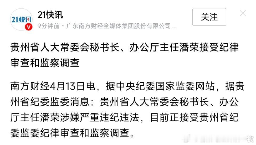 贵州省人大常委会秘书长、办公厅主任潘荣接受纪律审查和监察调查!