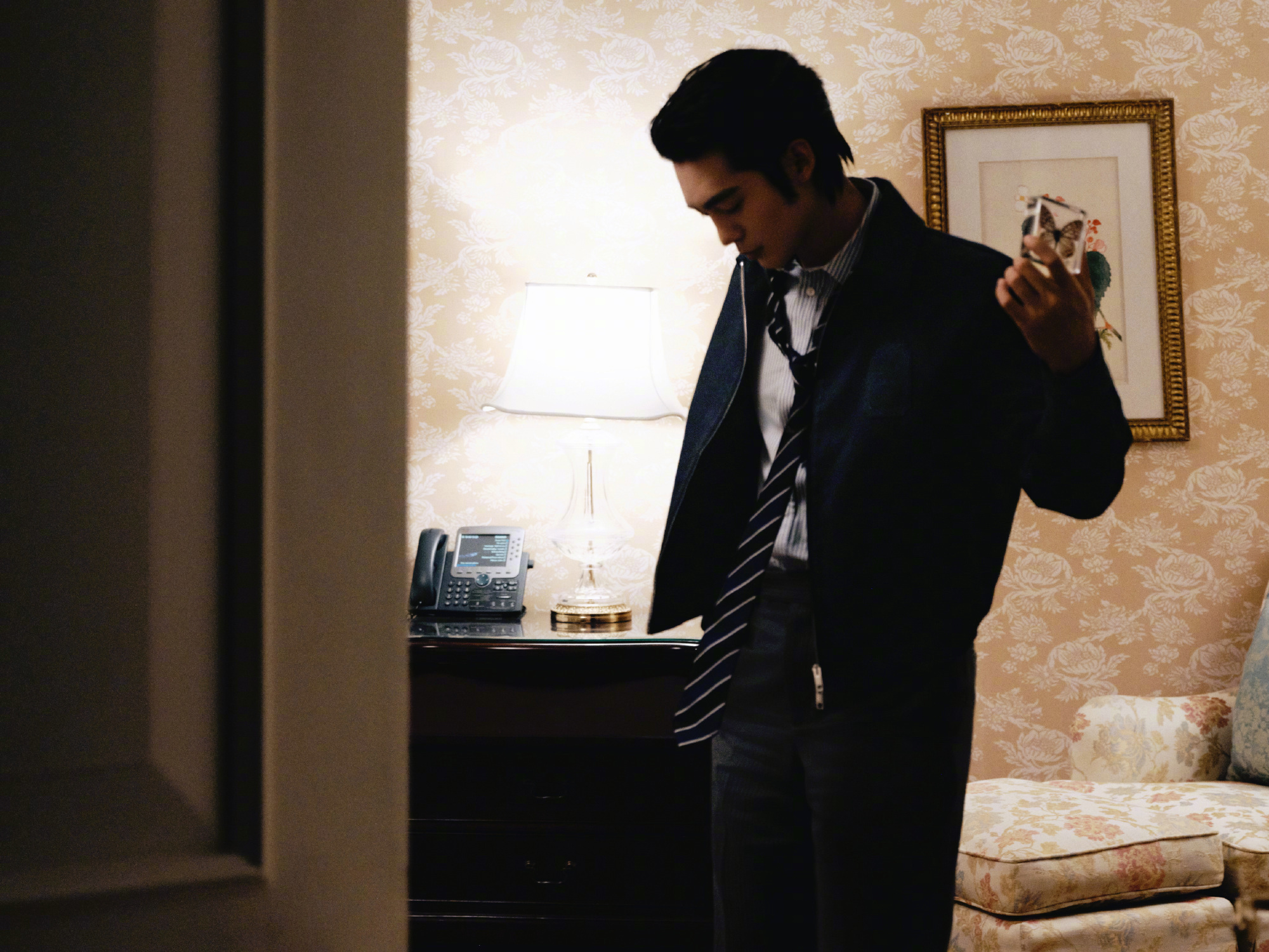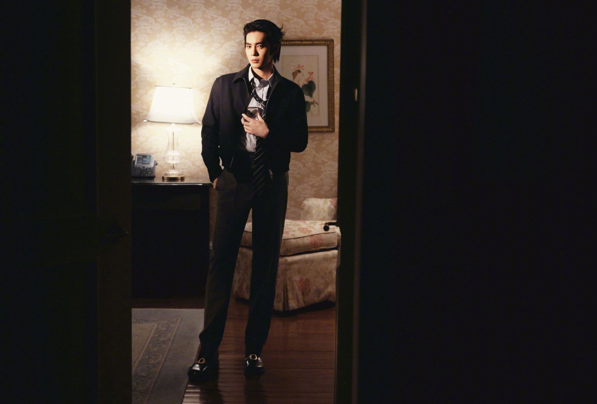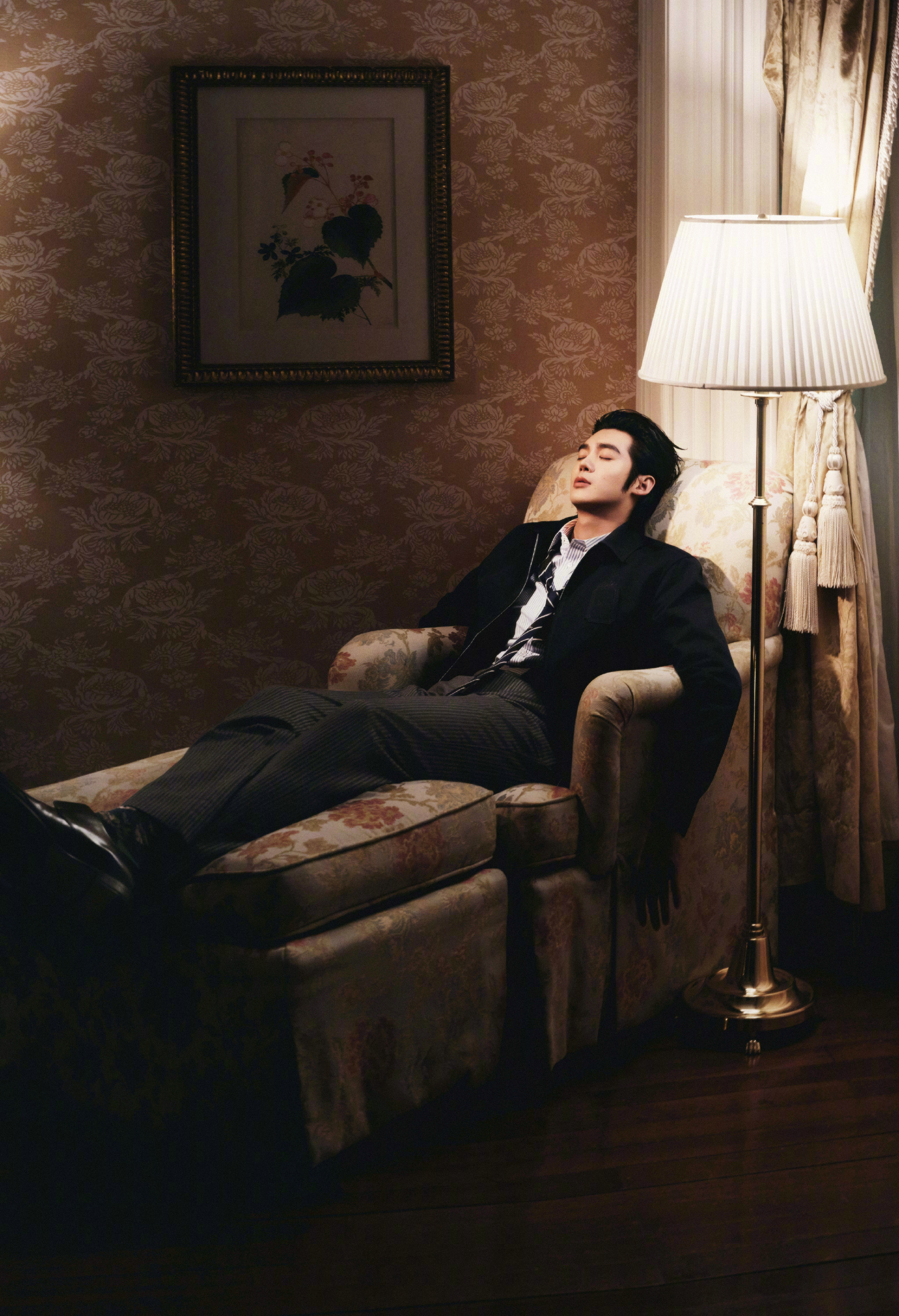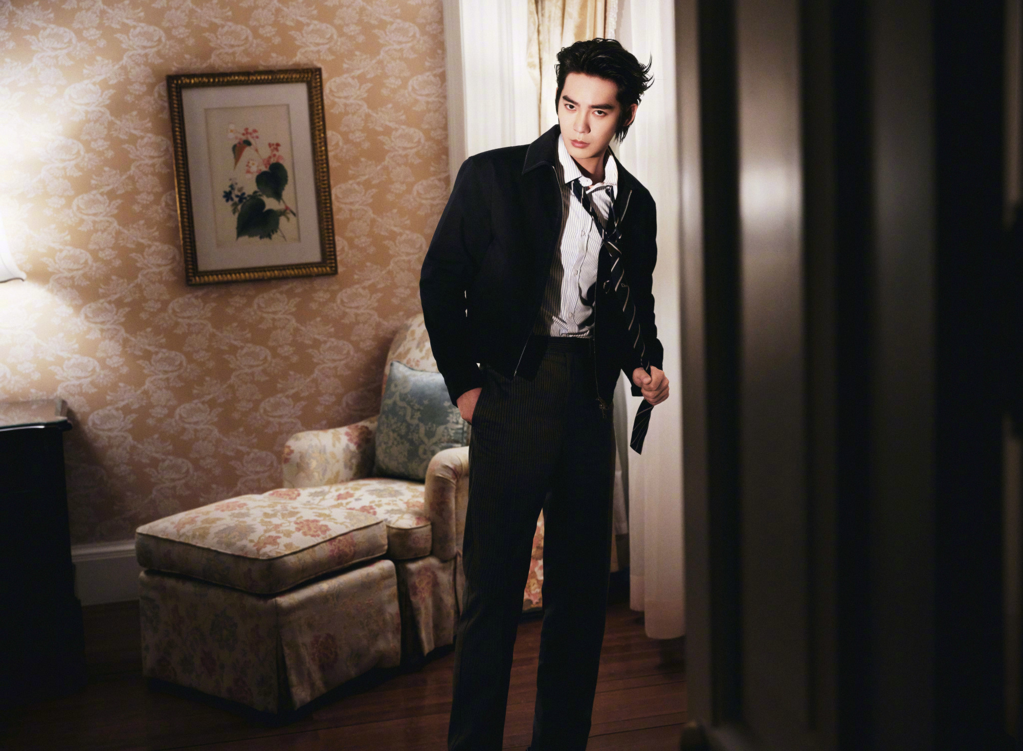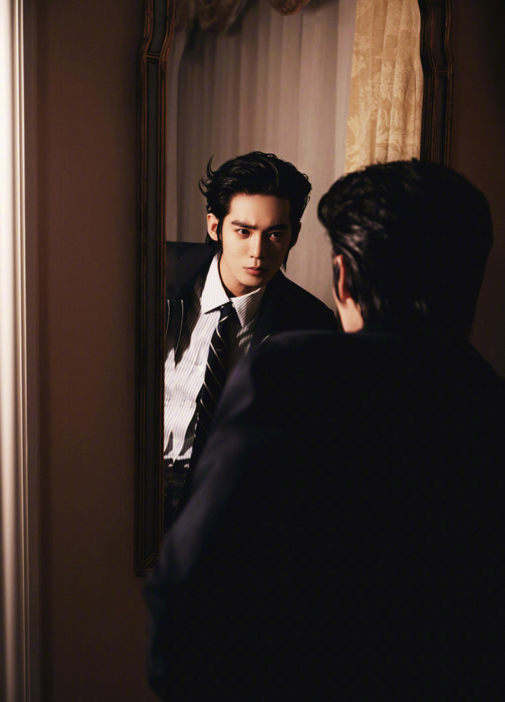 于适 in Dior 📷 今日活动造型图,夹克搭条纹领带,梳起利落大背头,硬