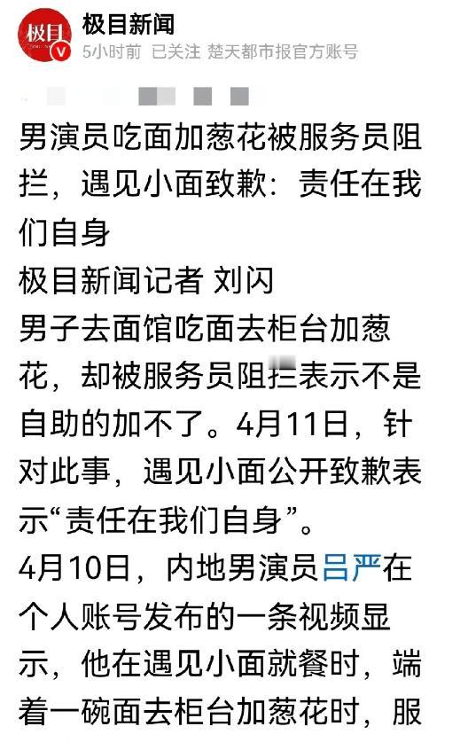 吕严遇小面加葱花被拒 品牌方致歉:责任在自身——极目新闻