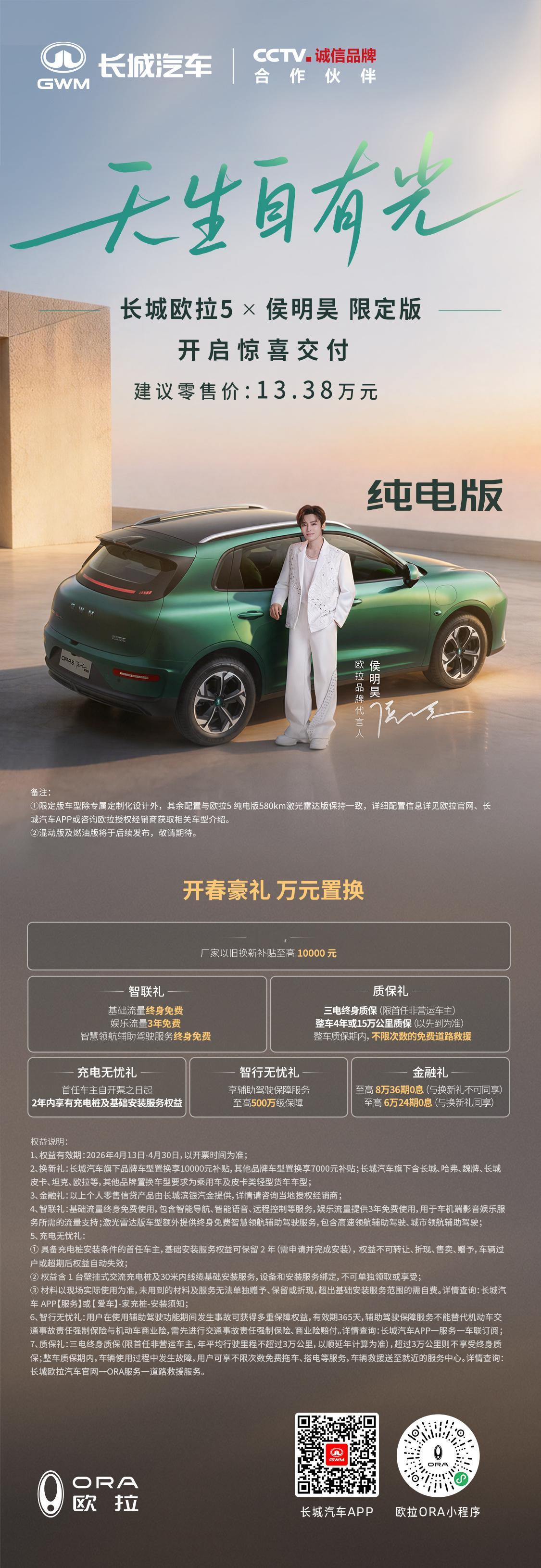 长城欧拉5 明星限定版纯电版长城欧拉5明星限定版纯电版,今天刚上,13.38万,还限量99台。跟高配版同价,但加量不加价。专属敦煌绿车漆,内饰有刺绣、专属脚垫,车机还有侯明昊的语音包续航580km,带激光雷达和高阶智驾。快充、外放电都有。纯电SUV,颜值、智能、实用性全拉满,刚上线就卖光了。