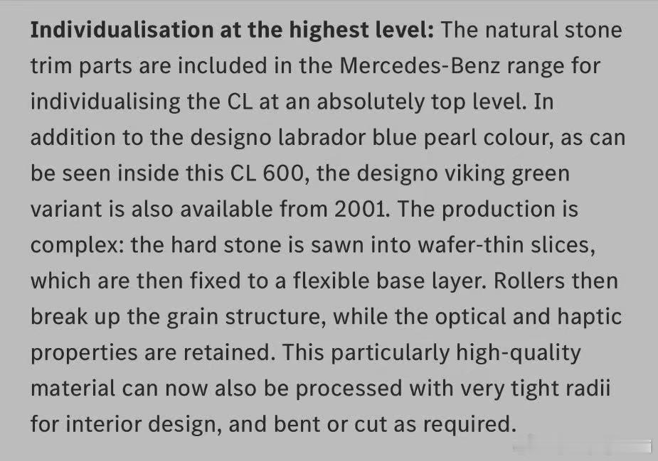 发了我一组关于奔驰Designo中特殊材料的图片,将天然石材运用于汽车内饰确实不多见,以前吃的还是太好,学习了。