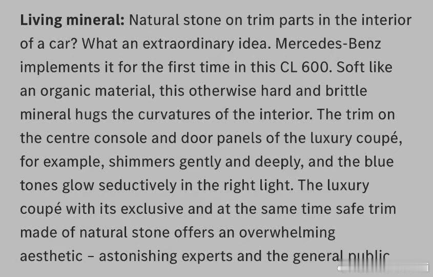 发了我一组关于奔驰Designo中特殊材料的图片,将天然石材运用于汽车内饰确实不