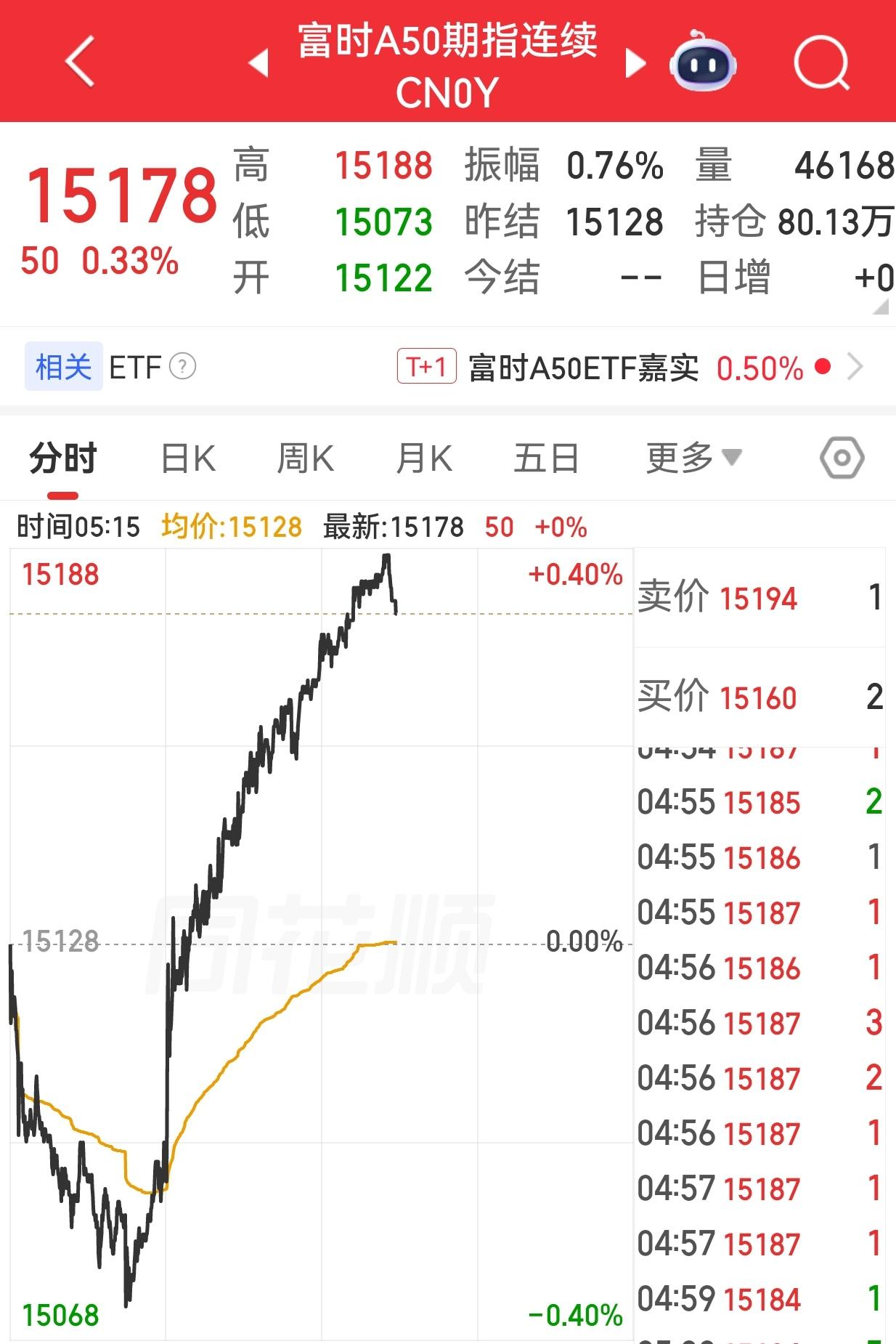 富时A50期指连续夜盘收涨0.33%,报15178点。