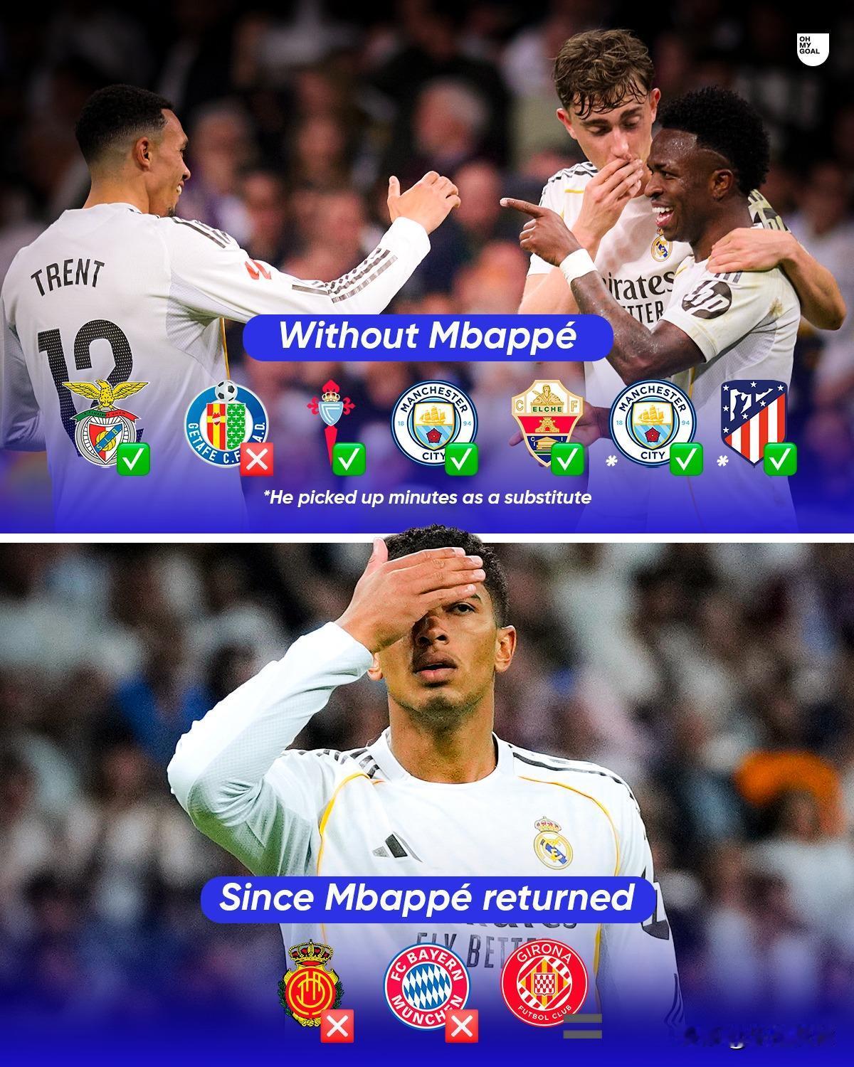 太离谱了!现在的皇马,正上演着本赛季欧洲足坛最魔幻的反差——没有姆巴佩的时候,他们是赢遍全欧的欧冠王者;姆巴佩一回归,球队直接连翻3车,生死战难求一胜!