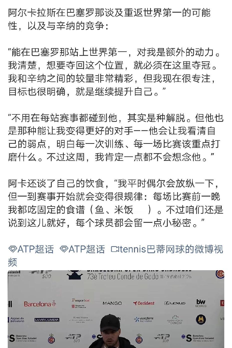 阿尔卡拉斯会继续参加ATP500赛巴塞罗那!为了世界第一拼了,这周后没准又能回到