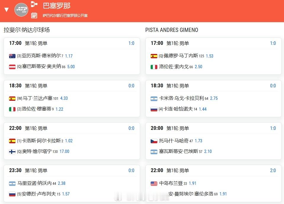 ATP500巴塞罗那站首轮22:00 [1] 阿尔卡拉斯🇪🇸vs维尔塔宁🇫🇮