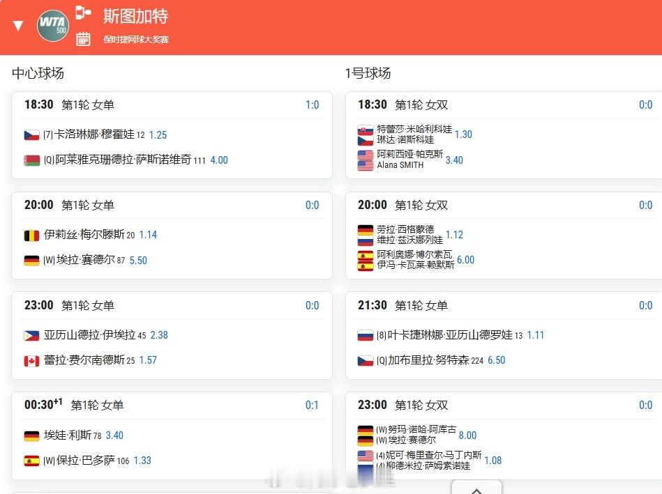 WTA500斯图加特站首轮18:30 穆霍娃🇨🇿vs萨斯诺维奇白俄罗斯🇧🇾23:00 伊埃拉vs费尔南德斯