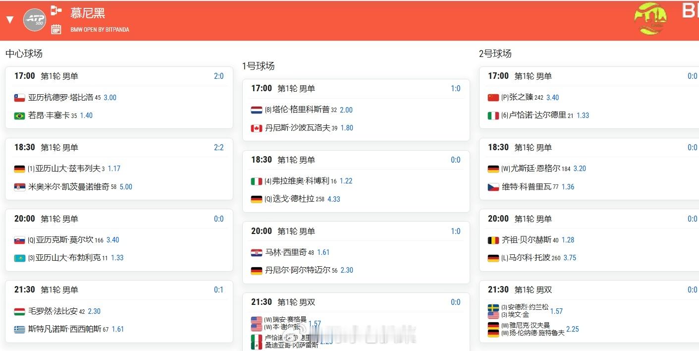 ATP500慕尼黑站首轮17:00 张之臻🇨🇳vs[6]达尔德里🇮🇹18:30 [1]兹维列夫🇩🇪vs凯茨曼诺维奇🇷🇸