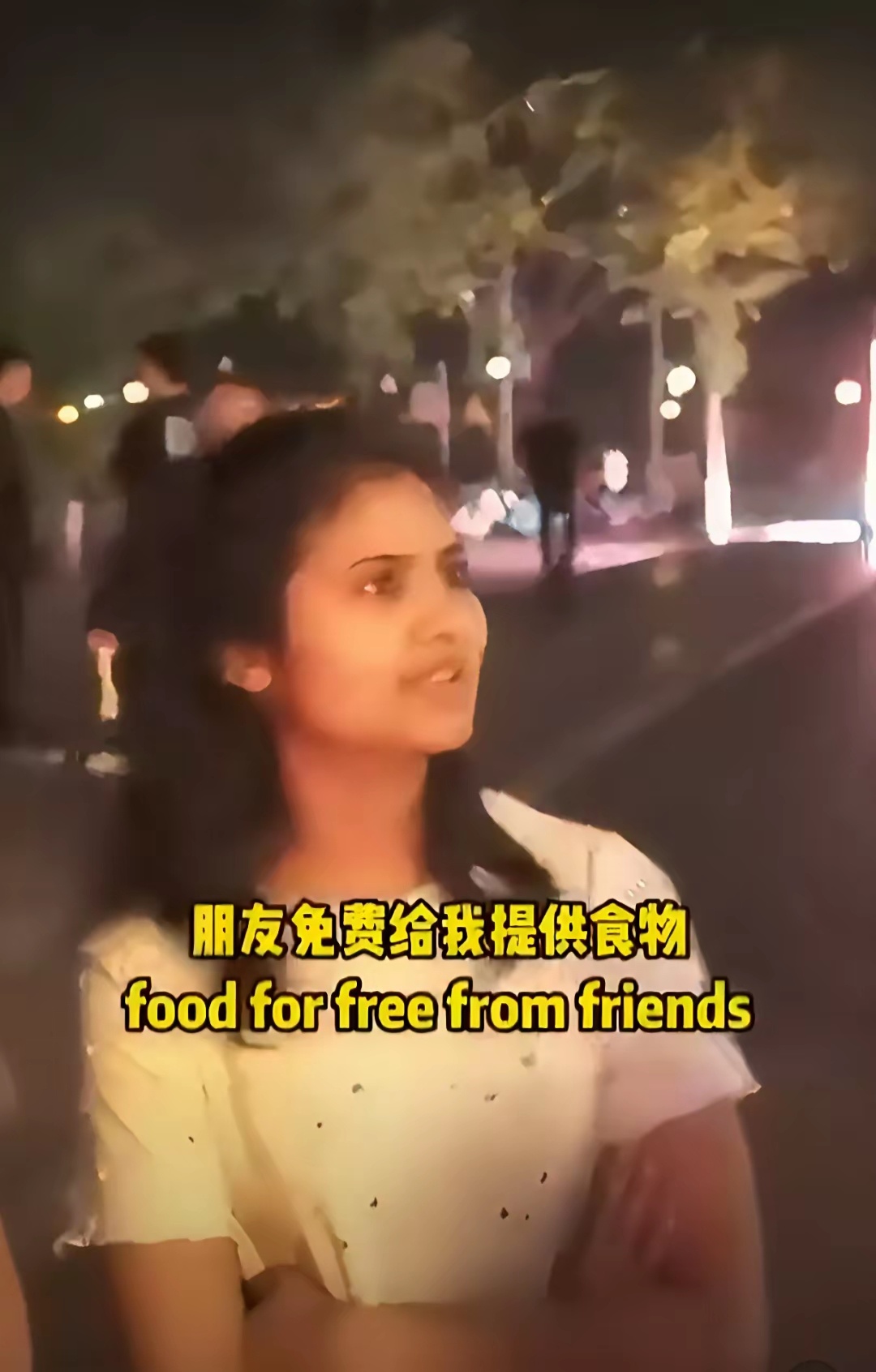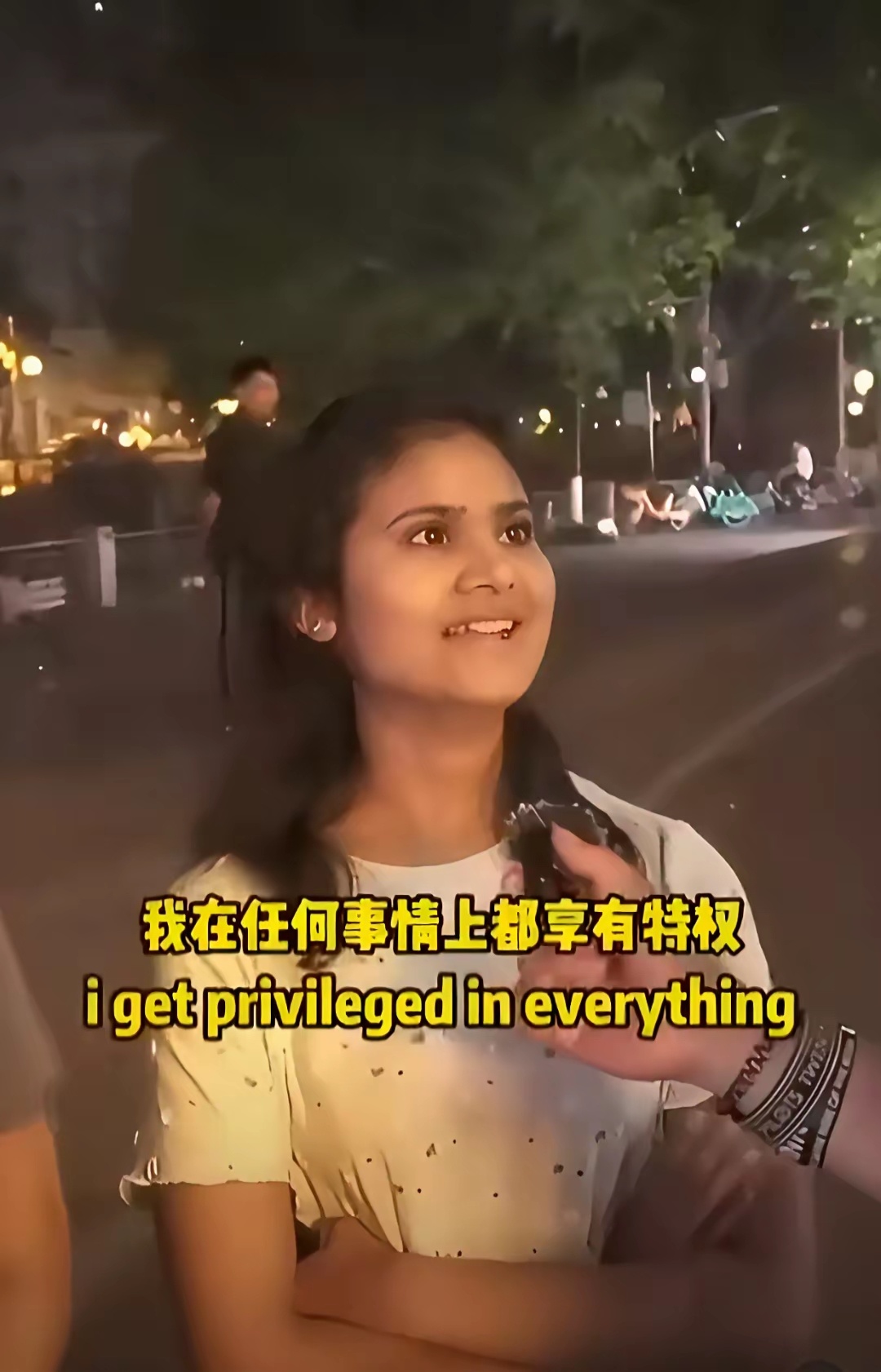 记者: 你对中国最大的感受是什么?印度女孩: 非常安全,还有我在任何事情上都享有特权。记者: 比如?印度女孩: 朋友们免费给我提供食物!