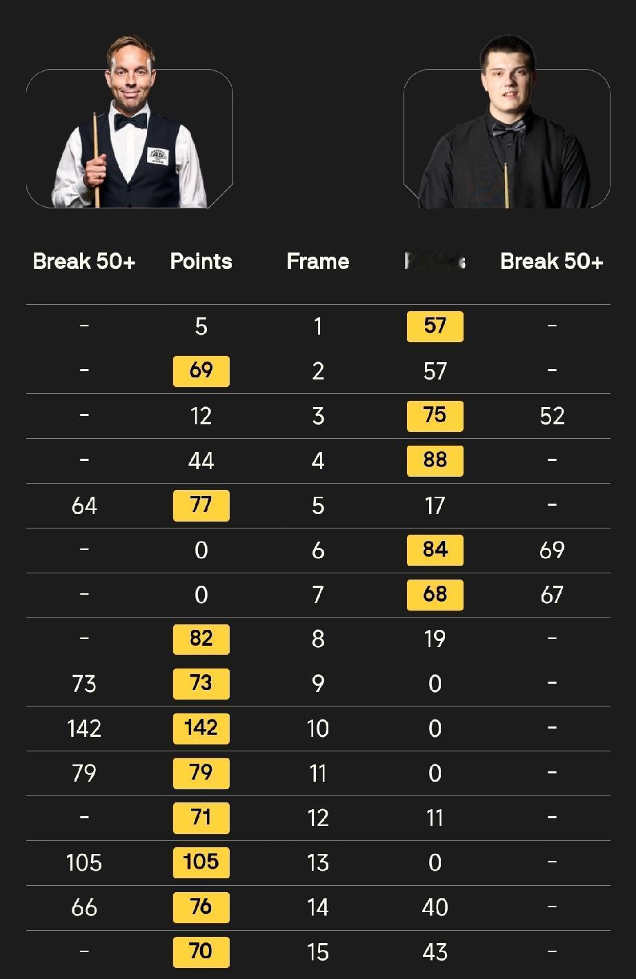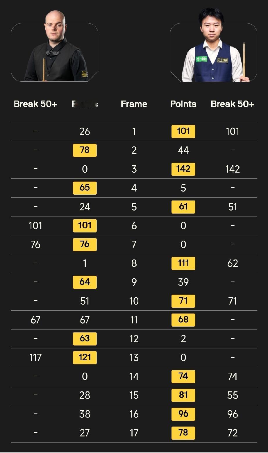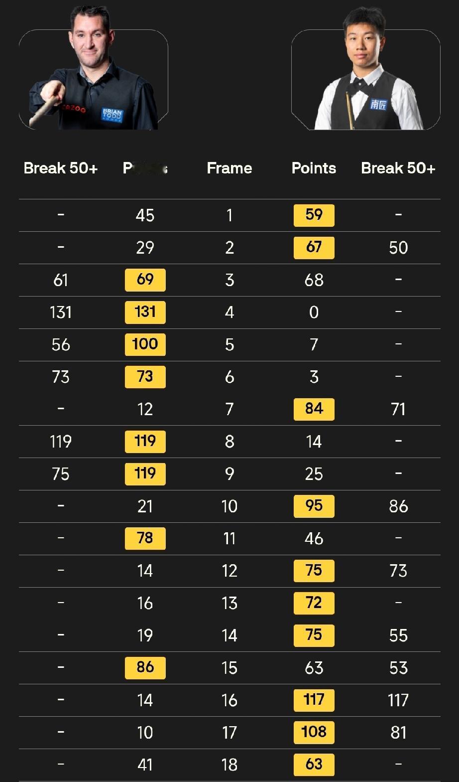 他在对阵奥德奈尔时,一度以 4:9 被逼到悬崖边。但他硬是顶住压力轰出一波6连鞭,最终 10:9 绝杀晋级,堪称“续命”神操作。