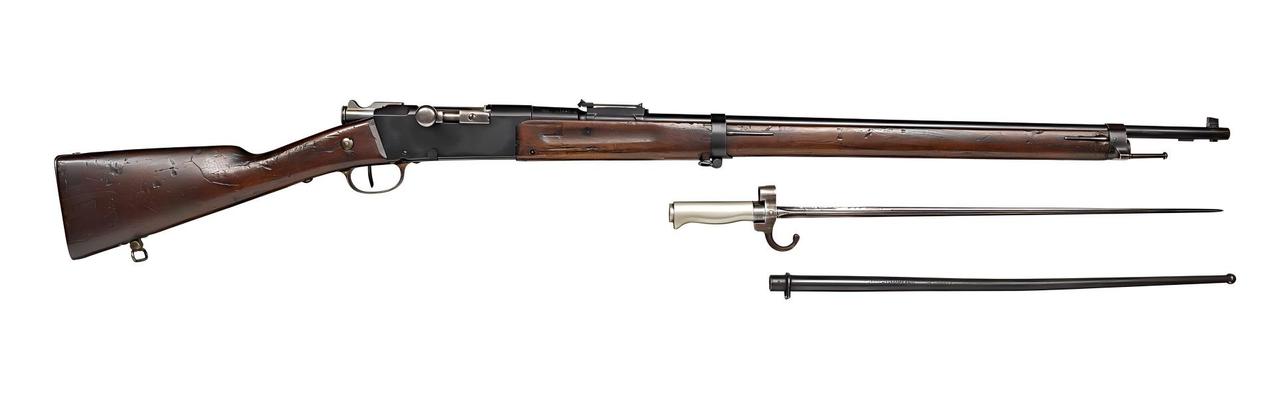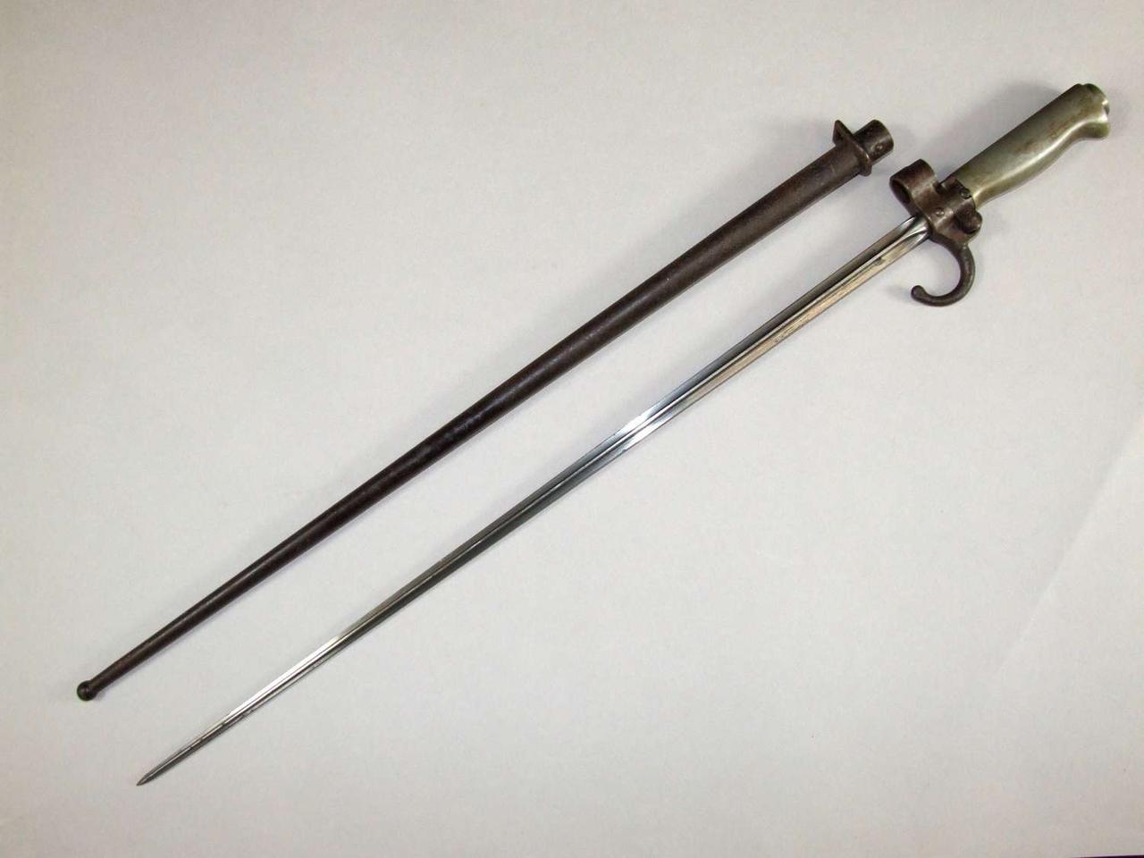 大家注意,画面右侧那位士兵腰间的刺刀很有意思,不是剑形刺刀,看上去像是勒贝尔 M1886步枪的棱锥刺刀(参见图2)。这种棱锥刺刀使用套筒式刀鞘,采用黄铜手柄,制造非常精良(参见图3)。