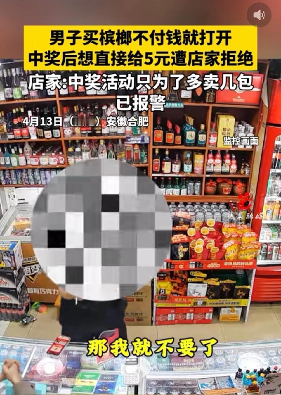 安徽合肥,男子到商店买槟榔,没有付钱拿起一袋槟榔就拆开,扫码发现中奖后,这才准备支付5元钱,还要老板给他兑换奖品。老板气不过,直言店里不支持兑奖,还斥责他:你起码要先买了再拆开,你这样我不能给你兑奖。男子:不给兑奖那我不要了,你报警吧!
