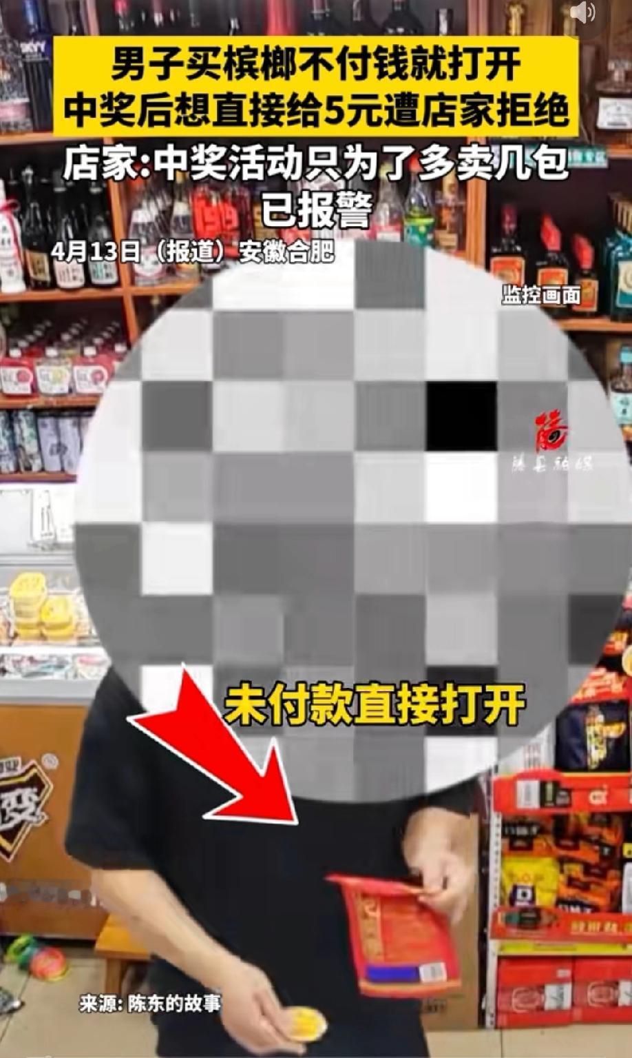 安徽合肥,男子到商店买槟榔,没有付钱拿起一袋槟榔就拆开,扫码发现中奖后,这才准备