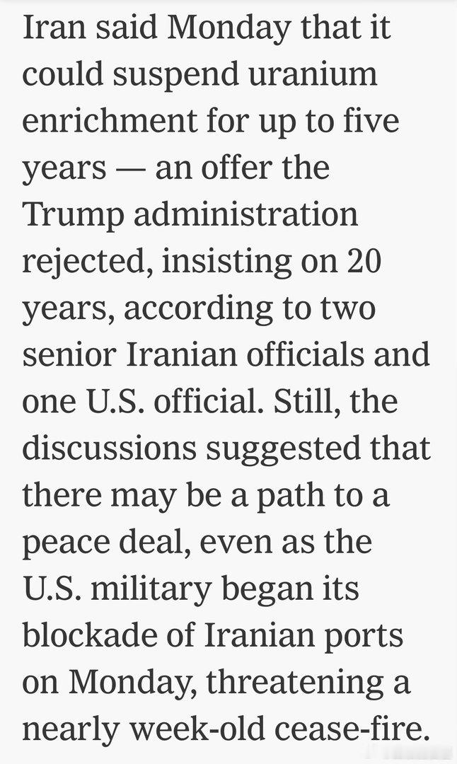 伊朗最新提议:停止核活动五年美国拒绝,坚持:停二十年至少,双方还在谈