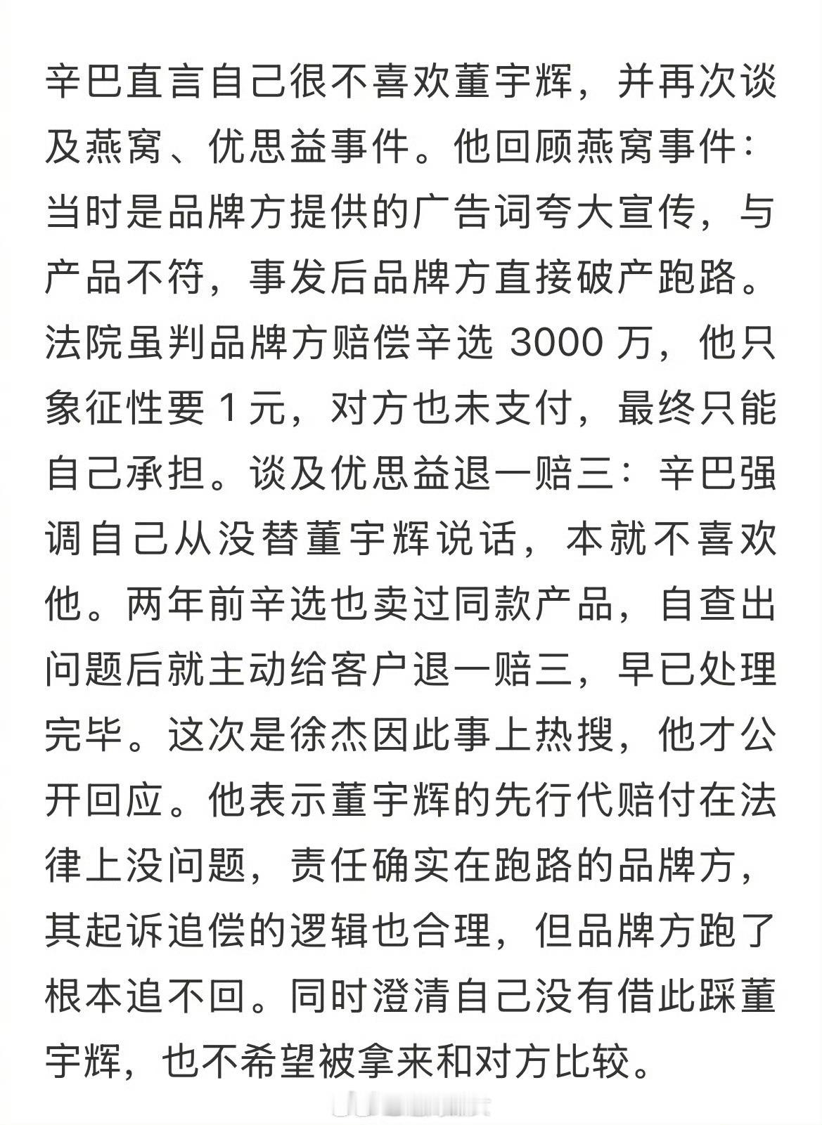 辛巴谈退一赔三被说比董宇辉有担当,不想拉踩和攻击,董宇辉先退款追责再赔付没问题