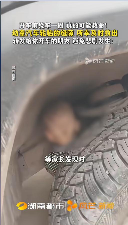 信息来源:《开车前绕车一圈 真的可能救命! 幼童汽车轮胎的缝隙 所幸及时救出 转发给你开车的朋友 避免悲剧发生!》风芒新闻