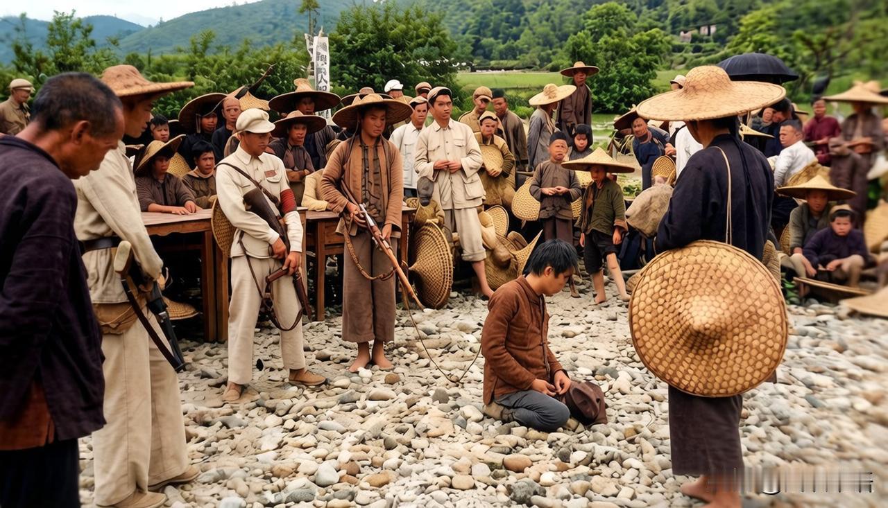 1950年,广东佛冈县的一处村落河滩上正在召开公审大会,一名“匪特”头目被绳子捆着跪在乱石堆中,一副垂头丧气的模样,旁边是持枪的民兵和战士。